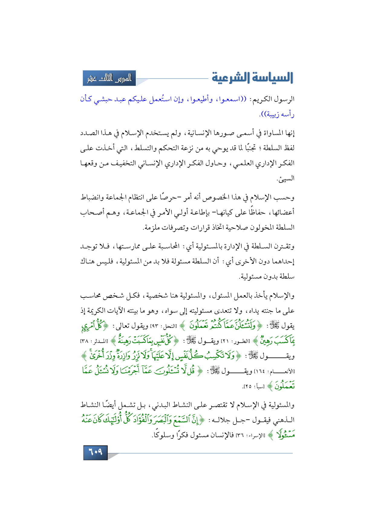 الرسول الكريم: ((اسمعوا، وأطيعوا، وإن استُعمل عليكم عبد حبشي كأن رأسه ذبيبة)) إنها المساواة في أسمى صورها الإنسانية، ولم يستخدم الإسلام في هذا الصدد لفظ السلطة؛ تجنبًا لما قد يوحي به من نزعة التحكم والتسلط، التي أخذت على الفكر الإداري العلمي، وحاول الفكر الإداري الإنساني التخفيف من وقعها السيئ.