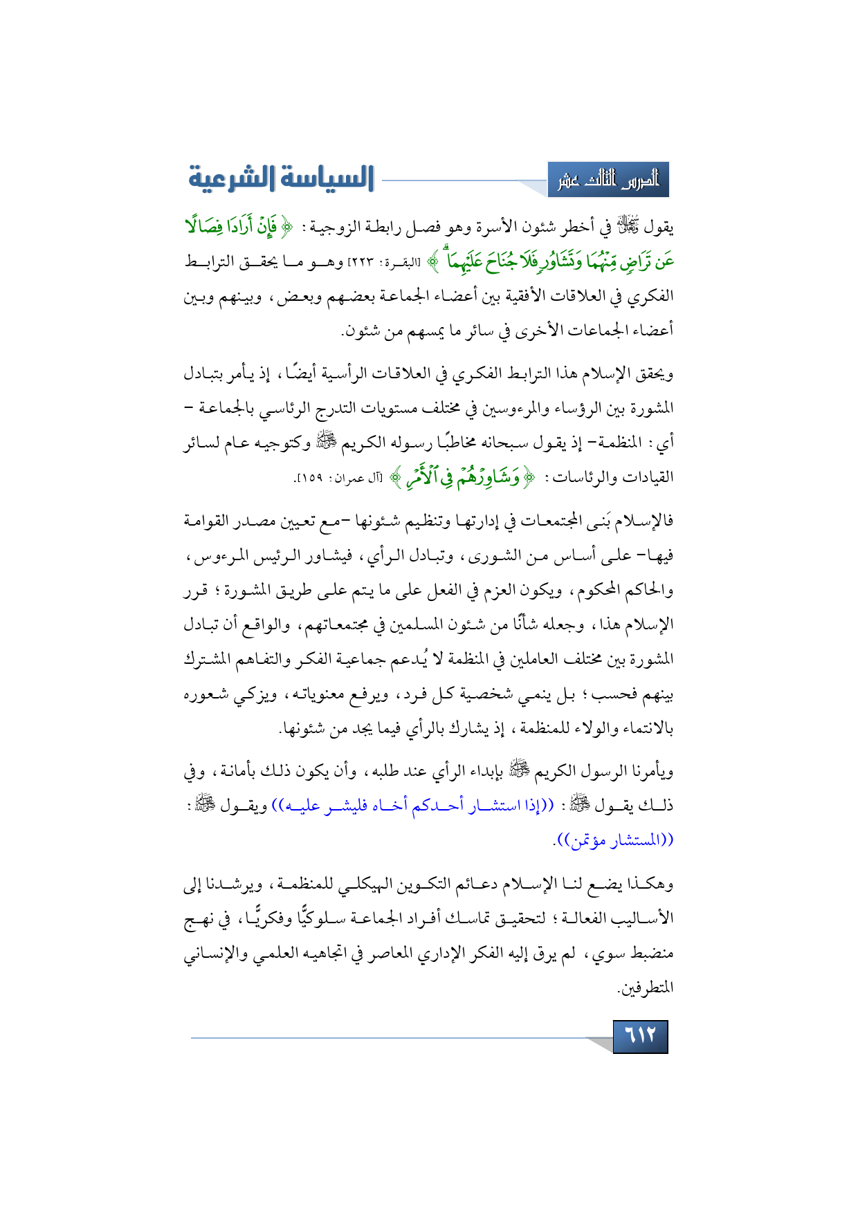 يقول -سبحانه وتعالى- في أخطر شئون الأسرة وهو فصل رابطة الزوجية: {فَإِنْ أَرَادَا فِصَالًا عَنْ تَرَاضٍ مِنْهُمَا وَتَشَاوُرٍ فَلا جُنَاحَ عَلَيْهِمَا} (البقرة: من الآية: 223) وهو ما يحقق الترابط الفكري في العلاقات الأفقية بين أعضاء الجماعة بعضهم وبعض، وبينهم وبين أعضاء الجماعات الأخرى في سائر ما يمسهم من شئون.