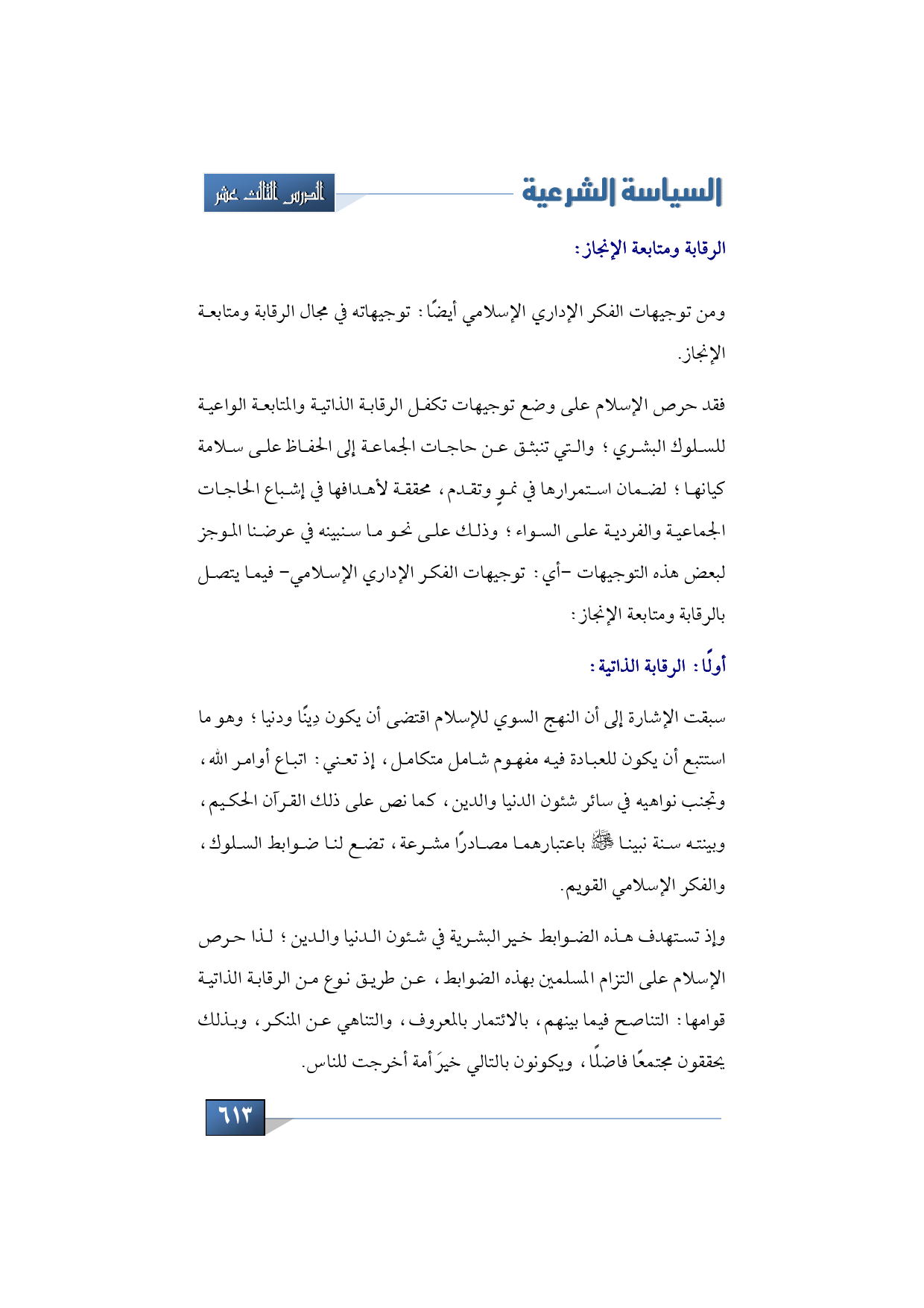فقد حرص الإسلام على وضع توجيهات تكفل الرقابة الذاتية والمتابعة الواعية للسلوك البشري؛ والتي تنبثق عن حاجات الجماعة إلى الحفاظ على سلامة كيانها؛ لضمان استمرارها في نموٍ وتقدم، محققة لأهدافها في إشباع الحاجات الجماعية والفردية على السواء؛ وذلك على نحو ما سنبينه في عرضنا الموجز لبعض هذه التوجيهات -أي: توجيهات الفكر الإداري الإسلامي- فيما يتصل بالرقابة ومتابعة الإنجاز: