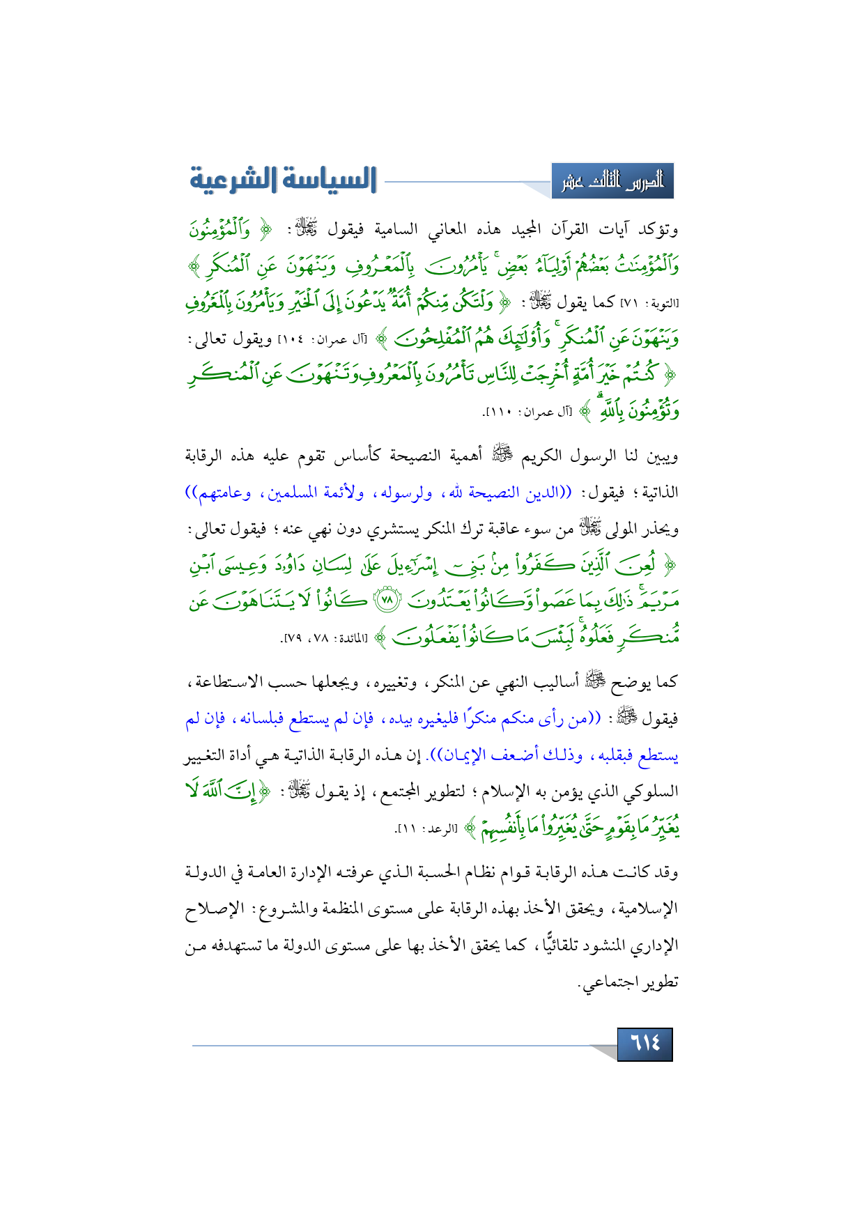 وتؤكد آيات القرآن المجيد هذه المعاني السامية فيقول -سبحانه وتعالى-: {وَالْمُؤْمِنُونَ وَالْمُؤْمِنَاتُ بَعْضُهُمْ أَوْلِيَاءُ بَعْضٍ يَأْمُرُونَ بِالْمَعْرُوفِ وَيَنْهَوْنَ عَنْ الْمُنكَرِ} (التوبة: من الآية: 71) كما يقول -سبحانه وتعالى-: {وَلْتَكُنْ مِنْكُمْ أُمَّةٌ يَدْعُونَ إِلَى الْخَيْرِ وَيَأْمُرُونَ بِالْمَعْرُوفِ وَيَنْهَوْنَ عَنْ الْمُنْكَرِ وَأُوْلَئِكَ هُمُ الْمُفْلِحُونَ} (آل عمران: 104) ويقول تعالى: {كُنْتُمْ خَيْرَ أُمَّةٍ أُخْرِجَتْ لِلنَّاسِ تَأْمُرُونَ بِالْمَعْرُوفِ وَتَنْهَوْنَ عَنْ الْمُنكَرِ وَتُؤْمِنُونَ بِاللَّهِ} (آل عمران: من الآية: 110).