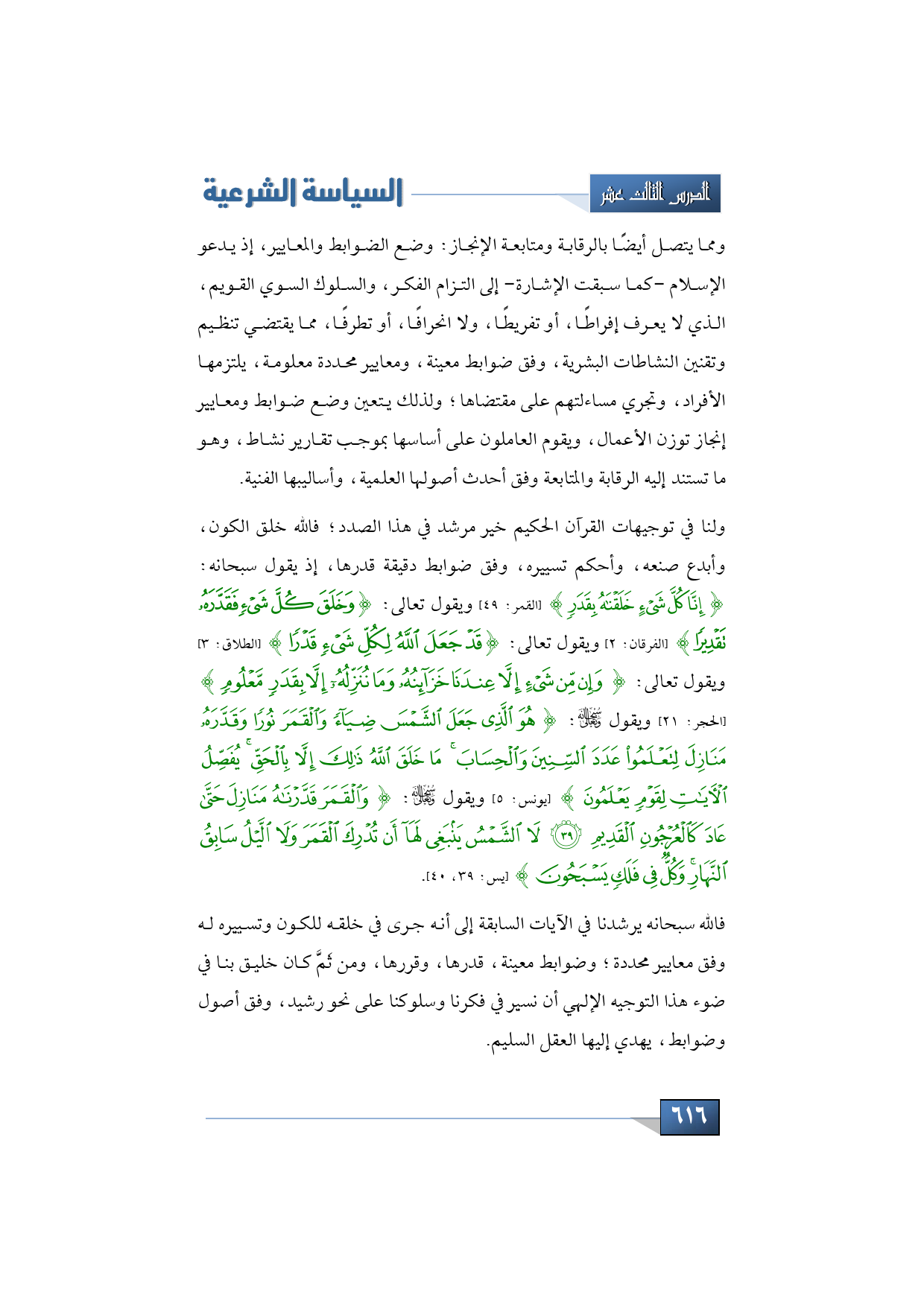 ولنا في توجيهات القرآن الحكيم خير مرشد في هذا الصدد؛ فالله خلق الكون، وأبدع صنعه، وأحكم تسييره، وفق ضوابط دقيقة قدرها، إذ يقول سبحانه: {إِنَّا كُلَّ شَيْءٍ خَلَقْنَاهُ بِقَدَرٍ} (القمر: 49) ويقول تعالى: {وَخَلَقَ كُلَّ شَيْءٍ فَقَدَّرَهُ تَقْدِيرًا} (الفرقان: من الآية: 2) ويقول تعالى: {قَدْ جَعَلَ اللَّهُ لِكُلِّ شَيْءٍ قَدْرا} (الطلاق: من الآية: 3) ويقول تعالى: {وَإِنْ مِنْ شَيْءٍ إِلاَّ عِنْدَنَا خَزَائِنُهُ وَمَا نُنَزِّلُهُ إِلاَّ بِقَدَرٍ مَعْلُومٍ} (الحجر: 21) ويقول -تبارك وتعالى-: {هُوَ الَّذِي جَعَلَ الشَّمْسَ ضِيَاءً وَالْقَمَرَ نُورًا وَقَدَّرَهُ مَنَازِلَ لِتَعْلَمُوا عَدَدَ السِّنِينَ وَالْحِسَابَ مَا خَلَقَ اللَّهُ ذَلِكَ إِلاَّ بِالْحَقِّ يُفَصِّلُ الآيَاتِ لِقَوْمٍ يَعْلَمُونَ} (يونس: 5) ويقول -تبارك وتعالى-: {وَالْقَمَرَ قَدَّرْنَاهُ مَنَازِلَ حَتَّى عَادَ كَالْعُرْجُونِ الْقَدِيمِ لا الشَّمْسُ يَنْبَغِي لَهَا أَنْ تُدْرِكَ الْقَمَرَ وَلا اللَّيْلُ سَابِقُ النَّهَارِ وَكُلٌّ فِي فَلَكٍ يَسْبَحُونَ} (يس: 39، 40).
