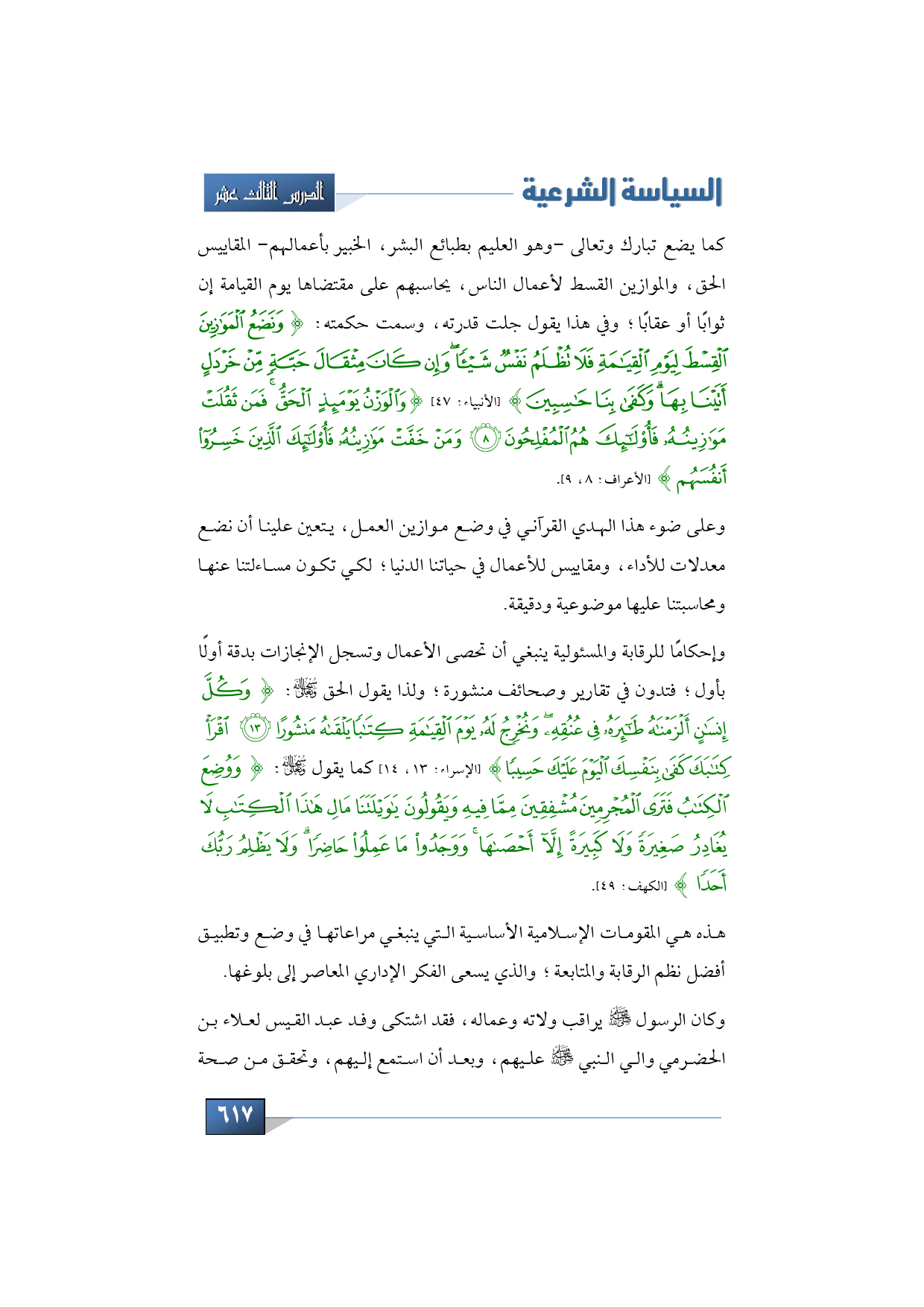 وعلى ضوء هذا الهدي القرآني في وضع موازين العمل، يتعين علينا أن نضع معدلات للأداء، ومقاييس للأعمال في حياتنا الدنيا؛ لكي تكون مساءلتنا عنها ومحاسبتنا عليها موضوعية ودقيقة، وإحكامًا للرقابة والمسئولية ينبغي أن تحصى الأعمال وتسجل الإنجازات بدقة أولًا بأول؛ فتدون في تقارير وصحائف منشورة؛ ولذا يقول الحق -تبارك وتعالى-: {وَكُلَّ إِنسَانٍ أَلْزَمْنَاهُ طَائِرَهُ فِي عُنُقِهِ وَنُخْرِجُ لَهُ يَوْمَ الْقِيَامَةِ كِتَابًا يَلْقَاهُ مَنشُورًا اقْرَأْ كِتَابَكَ كَفَى بِنَفْسِكَ الْيَوْمَ عَلَيْكَ حَسِيبًا} (الإسراء:13، 14) كما يقول -سبحانه وتعالى-: {وَوُضِعَ الْكِتَابُ فَتَرَى الْمُجْرِمِينَ مُشْفِقِينَ مِمَّا فِيهِ وَيَقُولُونَ يَا وَيْلَتَنَا مَالِ هَذَا الْكِتَابِ لا يُغَادِرُ صَغِيرَةً وَلا كَبِيرَةً إِلاَّ أَحْصَاهَا وَوَجَدُوا مَا عَمِلُوا حَاضِرًا وَلا يَظْلِمُ رَبُّكَ أَحَدًا} (الكهف: 49).