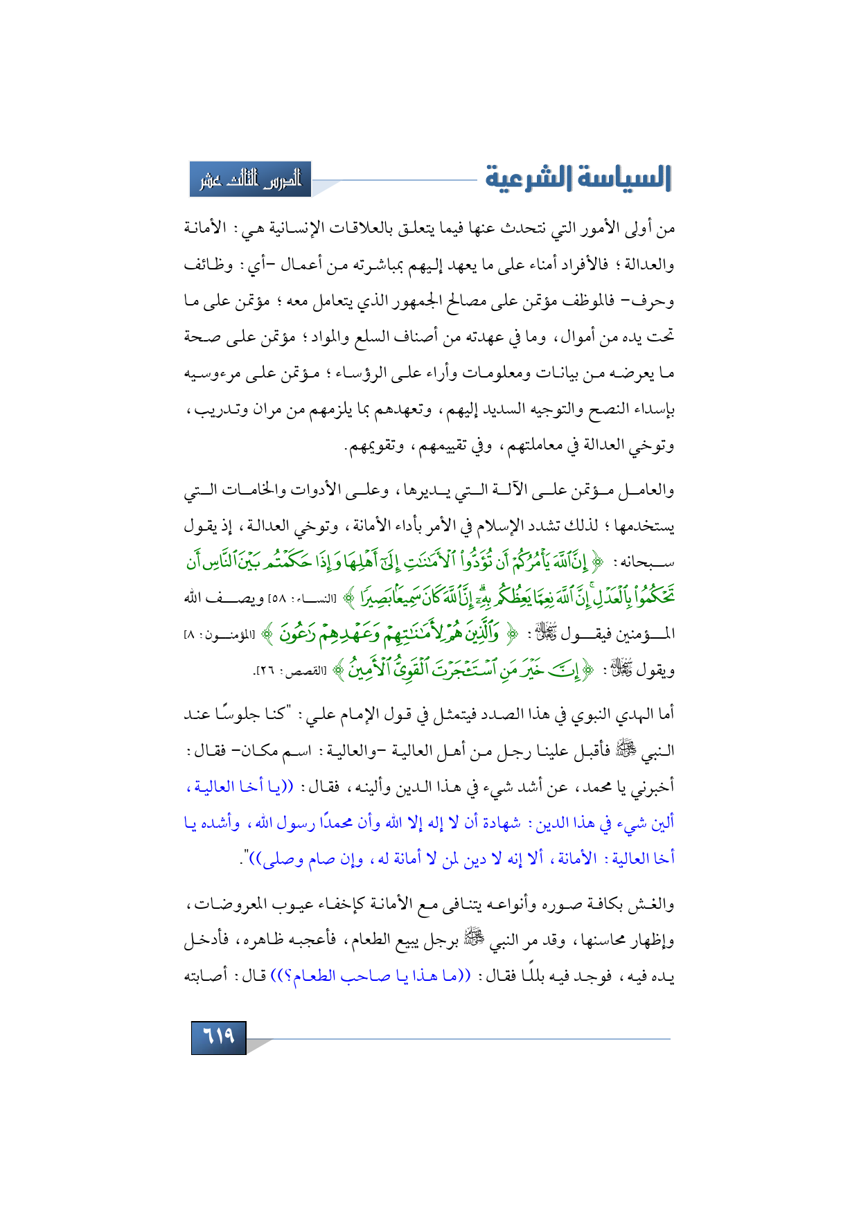 والعامل مؤتمن على الآلة التي يديرها، وعلى الأدوات والخامات التي يستخدمها؛ لذلك تشدد الإسلام في الأمر بأداء الأمانة، وتوخي العدالة، إذ يقول سبحانه: {إِنَّ اللَّهَ يَأْمُرُكُمْ أَنْ تُؤَدُّوا الأَمَانَاتِ إِلَى أَهْلِهَا وَإِذَا حَكَمْتُمْ بَيْنَ النَّاسِ أَنْ تَحْكُمُوا بِالْعَدْلِ إِنَّ اللَّهَ نِعِمَّا يَعِظُكُمْ بِهِ إِنَّ اللَّهَ كَانَ سَمِيعًا بَصِيرًا} (النساء: 58) ويصف الله المؤمنين فيقول- سبحانه وتعالى-: {وَالَّذِينَ هُمْ لأَمَانَاتِهِمْ وَعَهْدِهِمْ رَاعُونَ} (المؤمنون: 8) ويقول -تبارك وتعالى-: {إِنَّ خَيْرَ مَنِ اسْتَأْجَرْتَ الْقَوِيُّ الأَمِينُ} (القصص: من الآية: 26).