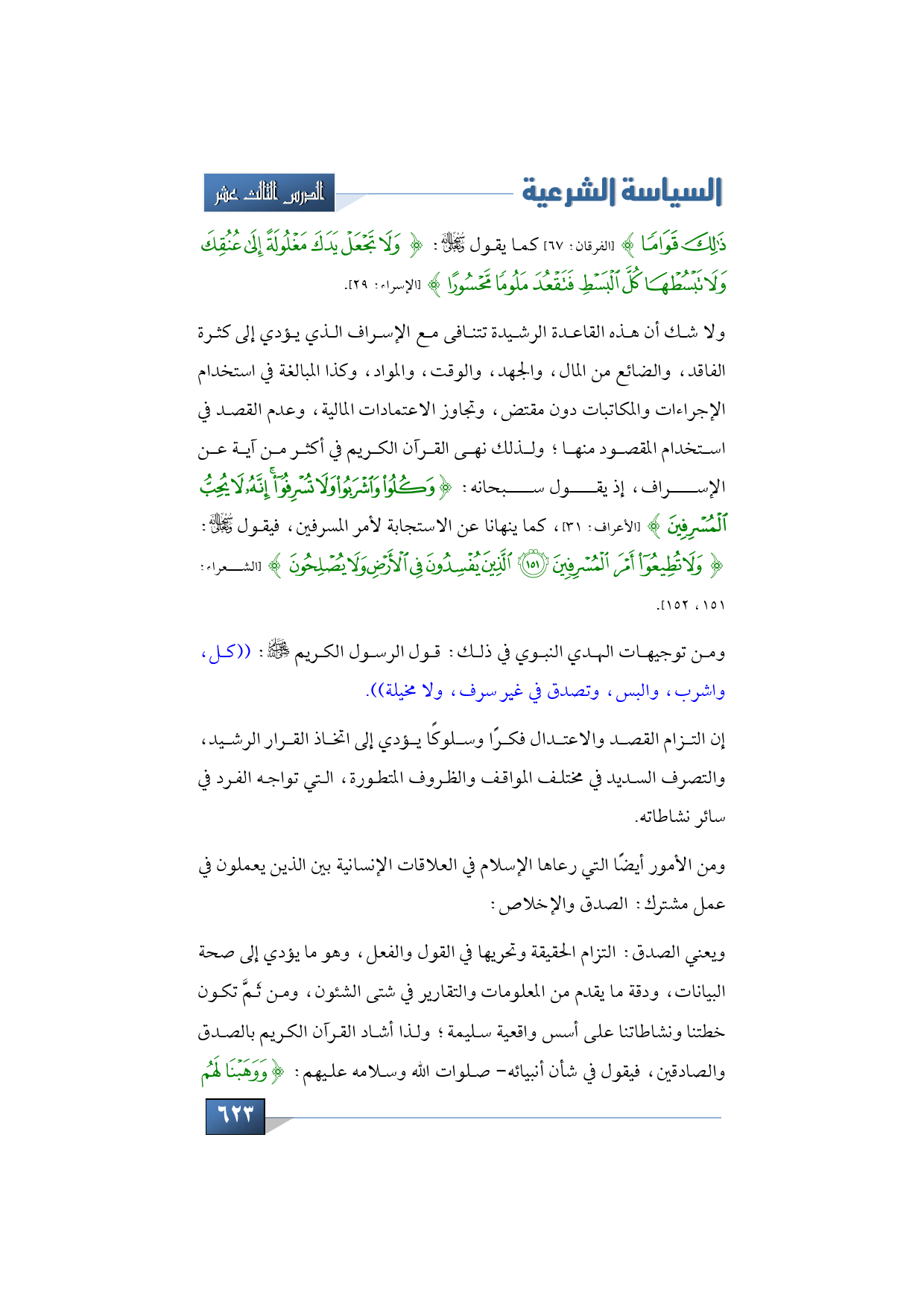 ذَلِكَ قَوَامًا} (الفرقان: 67) كما يقول -تبارك وتعالى-: {وَلا تَجْعَلْ يَدَكَ مَغْلُولَةً إِلَى عُنُقِكَ وَلا تَبْسُطْهَا كُلَّ الْبَسْطِ فَتَقْعُدَ مَلُومًا مَحْسُورًا} الإسراء الآية: 29) ولا شك أن هذه القاعدة الرشيدة تتنافى مع الإسراف الذي يؤدي إلى كثرة الفاقد، والضائع من المال، والجهد، والوقت، والمواد، وكذا المبالغة في استخدام الإجراءات والمكاتبات دون مقتض، وتجاوز الاعتمادات المالية، وعدم القصد في استخدام المقصود منها؛ ولذلك نهى القرآن الكريم أكثر من آية عن الإسراف، إذ يقول سبحانه: {وَكُلُوا وَاشْرَبُوا وَلا تُسْرِفُوا إِنَّهُ لا يُحِبُّ الْمُسْرِفِينَ} (الأعراف: من الآية: 21)، كما ينهانا عن الاستجابة لأمر المسرفين، فيقول -تبارك وتعالى-: {وَلا تُطِيعُوا أَمْرَ الْمُسْرِفِينَ الَّذِينَ يُفْسِدُونَ فِي الأَرْضِ وَلا يُصْلِحُونَ} (الشعراء:151، 152).