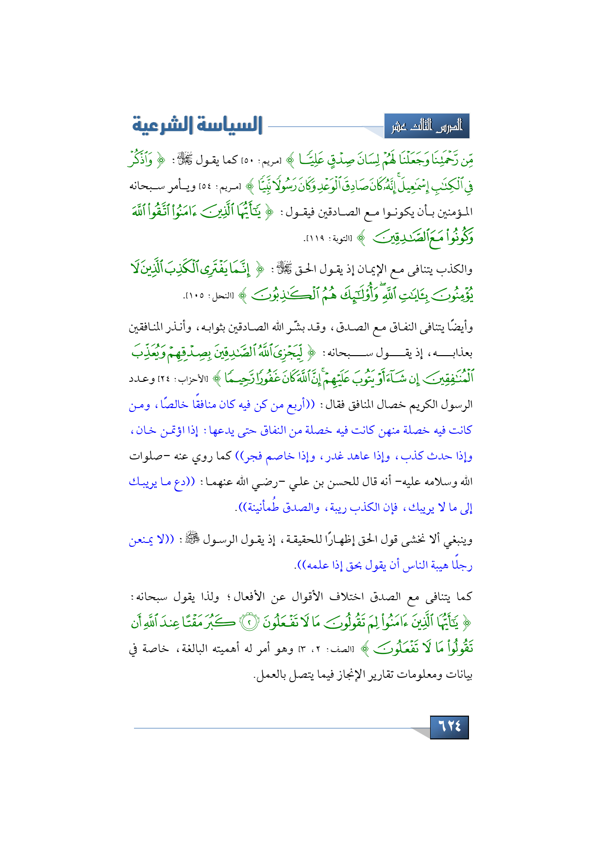مِنْ رَحْمَتِنَا وَجَعَلْنَا لَهُمْ لِسَانَ صِدْقٍ عَلِيًّا} (مريم: 50) كما يقول -تبارك وتعالى-: {وَاذْكُرْ فِي الْكِتَابِ إِسْمَاعِيلَ إِنَّهُ كَانَ صَادِقَ الْوَعْدِ وَكَانَ رَسُولًا نَبِيًّا} (مريم: 54) ويأمر سبحانه المؤمنين بأن يكونوا مع الصادقين فيقول: {يَا أَيُّهَا الَّذِينَ آمَنُوا اتَّقُوا اللَّهَ وَكُونُوا مَعَ الصَّادِقِينَ} (التوبة: 119) والكذب يتنافى مع الإيمان إذ يقول الحق -تبارك وتعالى-: {إِنَّمَا يَفْتَرِي الْكَذِبَ الَّذِينَ لا يُؤْمِنُونَ بِآيَاتِ اللَّهِ وَأُوْلَئِكَ هُمُ الْكَاذِبُونَ} (النحل: 105).