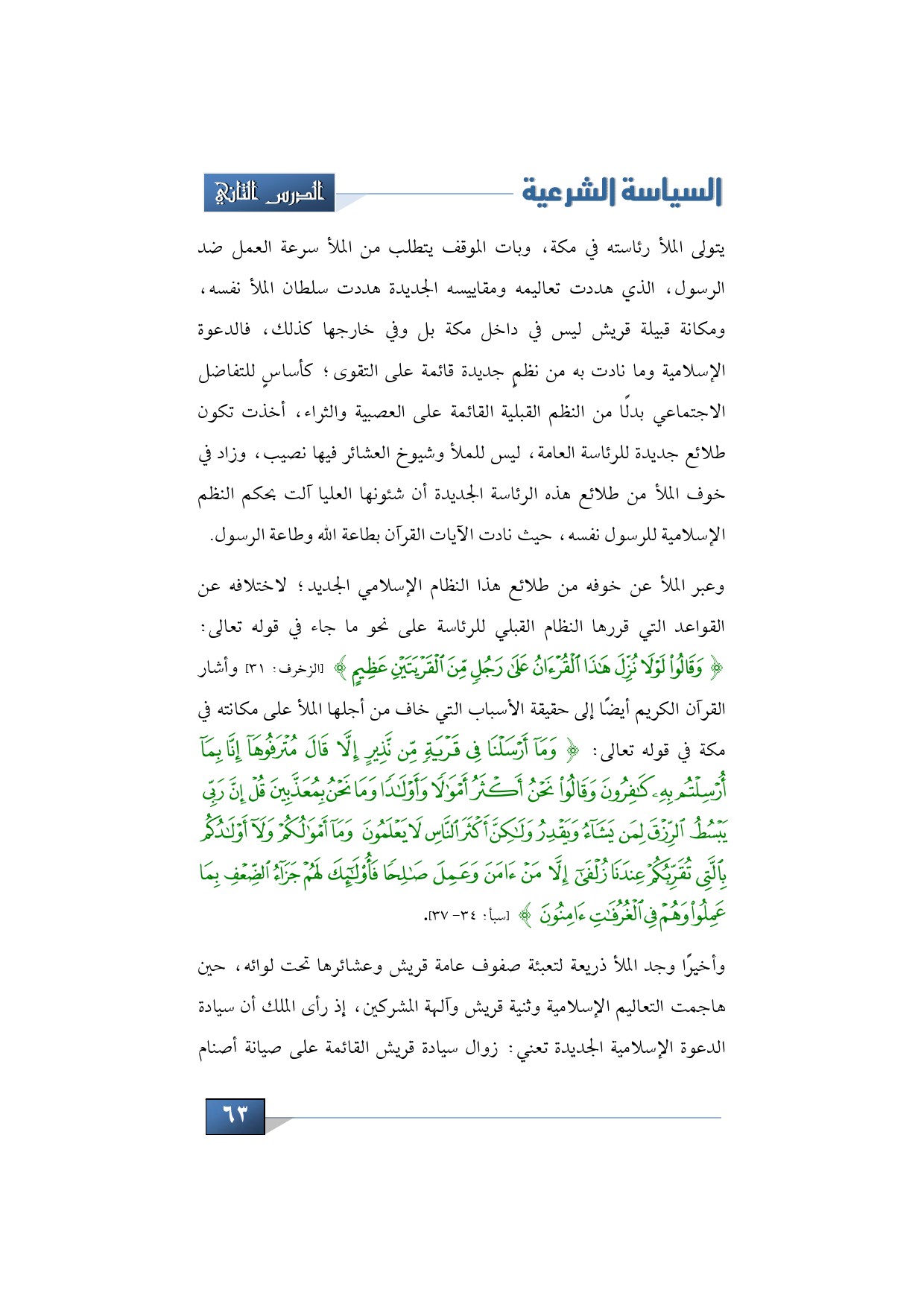 وعبر الملأ عن خوفه من طلائع هذا النظام الإسلامي الجديد؛ لاختلافه عن القواعد التي قررها النظام القبلي للرئاسة على نحو ما جاء في قوله تعالى: {وَقَالُوا لَوْلا نُزِّلَ هَذَا الْقُرْآنُ عَلَى رَجُلٍ مِنْ الْقَرْيَتَيْنِ عَظِيمٍ} (الزخرف: 31) وأشار القرآن الكريم أيضًا إلى حقيقة الأسباب التي خاف من أجلها الملأ على مكانته في مكة في قوله تعالى: {وَمَا أَرْسَلْنَا فِي قَرْيَةٍ مِنْ نَذِيرٍ إِلاَّ قَالَ مُتْرَفُوهَا إِنَّا بِمَا أُرْسِلْتُمْ بِهِ كَافِرُونَ وَقَالُوا نَحْنُ أَكْثَرُ أَمْوَالًا وَأَوْلادًا وَمَا نَحْنُ بِمُعَذَّبِينَ قُلْ إِنَّ رَبِّي يَبْسُطُ الرِّزْقَ لِمَنْ يَشَاءُ وَيَقْدِرُ وَلَكِنَّ أَكْثَرَ النَّاسِ لا يَعْلَمُونَ وَمَا أَمْوَالُكُمْ وَلا أَوْلادُكُمْ بِالَّتِي تُقَرِّبُكُمْ عِنْدَنَا زُلْفَى إِلاَّ مَنْ آمَنَ وَعَمِلَ صَالِحًا فَأُوْلَئِكَ لَهُمْ جَزَاءُ الضِّعْفِ بِمَا عَمِلُوا وَهُمْ فِي الْغُرُفَاتِ آمِنُونَ} (سبأ: 34 - 37)
