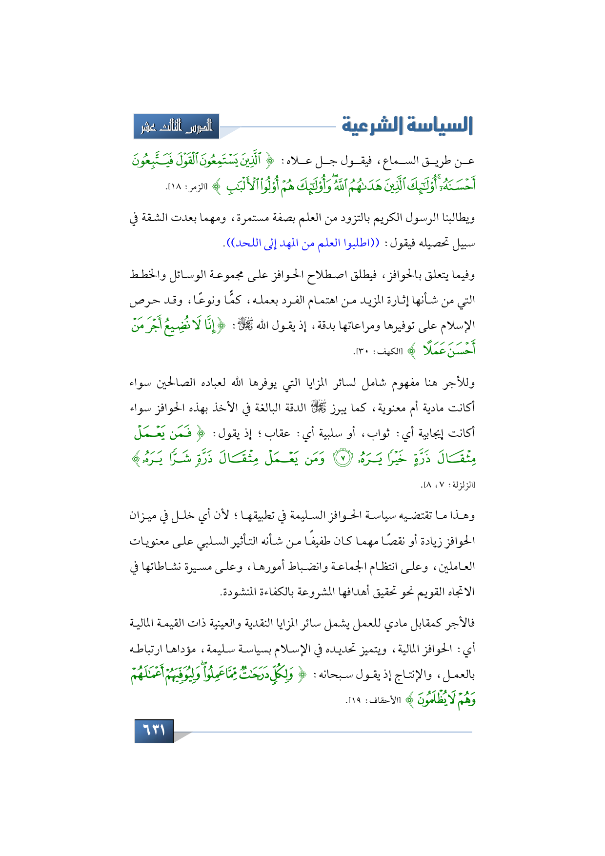 وهذا ما تقتضيه سياسة الحوافز السليمة في تطبيقها؛ لأن أي خلل في ميزان الحوافز زيادة أو نقصًا مهما كان طفيفًا من شأنه التأثير السلبي على معنويات العاملين، وعلى انتظام الجماعة وانضباط أمورها، وعلى مسيرة نشاطاتها في الاتجاه القويم نحو تحقيق أهدافها المشروعة بالكفاءة المنشودة، فالأجر كمقابل مادي للعمل يشمل سائر المزايا النقدية والعينية ذات القيمة المالية أي: الحوافز المالية، ويتميز تحديده في الإسلام بسياسة سليمة، مؤداها ارتباطه بالعمل، والإنتاج إذ يقول سبحانه: {وَلِكُلٍّ دَرَجَاتٌ مِمَّا عَمِلُوا وَلِيُوَفِّيَهُمْ أَعْمَالَهُمْ وَهُمْ لا يُظْلَمُونَ} (الأحقاف: 19).