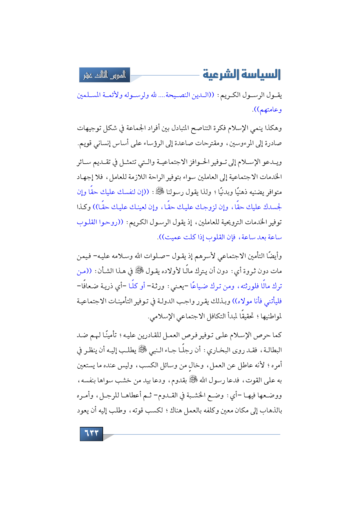 وأيضًا التأمين الاجتماعي لأسرهم إذ يقول -صلوات الله وسلامه عليه- فيمن مات دون ثروة أي: دون أن يترك مالًا لأولاده يقول -صلى الله عليه وسلم- في هذا الشأن: ((من ترك مالًا فلورثته، ومن ترك ضياعًا -يعني: ورثة- أو كلًا -أي ذرية ضعافًا- فليأتني فأنا مولاه)) وبذلك يقرر واجب الدولة في توفير التأمينات الاجتماعية لمواطنيها؛ تحقيقًا لمبدأ التكافل الاجتماعي الإسلامي.