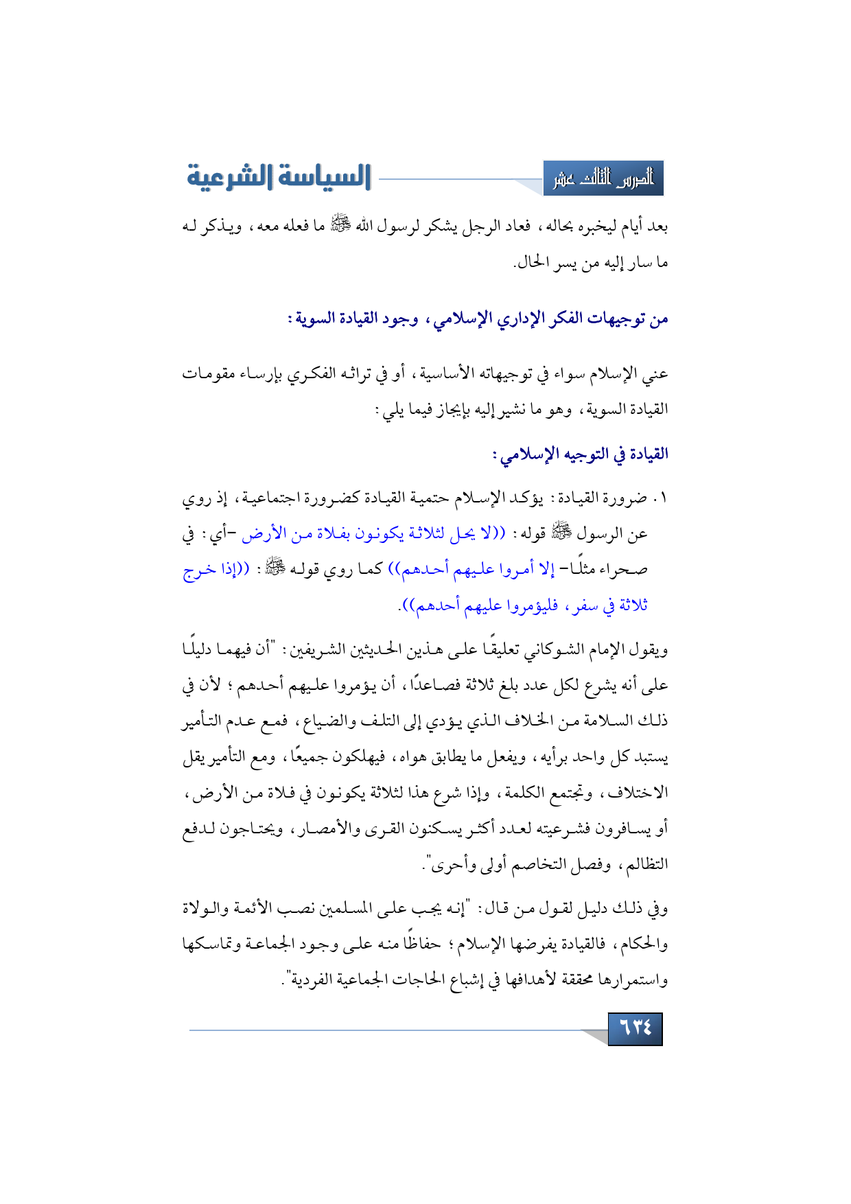 1 - ضرورة القيادة: يؤكد الإسلام حتمية القيادة كضرورة اجتماعية، إذ روي عن الرسول -صلى الله عليه وسلم- قوله: ((لا يحل لثلاثة يكونون بفلاة من الأرض -أي: في صحراء مثلًا- إلا أمروا عليهم أحدهم)) كما روي قوله -عليه الصلاة والسلام-: ((إذا خرج ثلاثة في سفر، فليؤمروا عليهم أحدهم)).