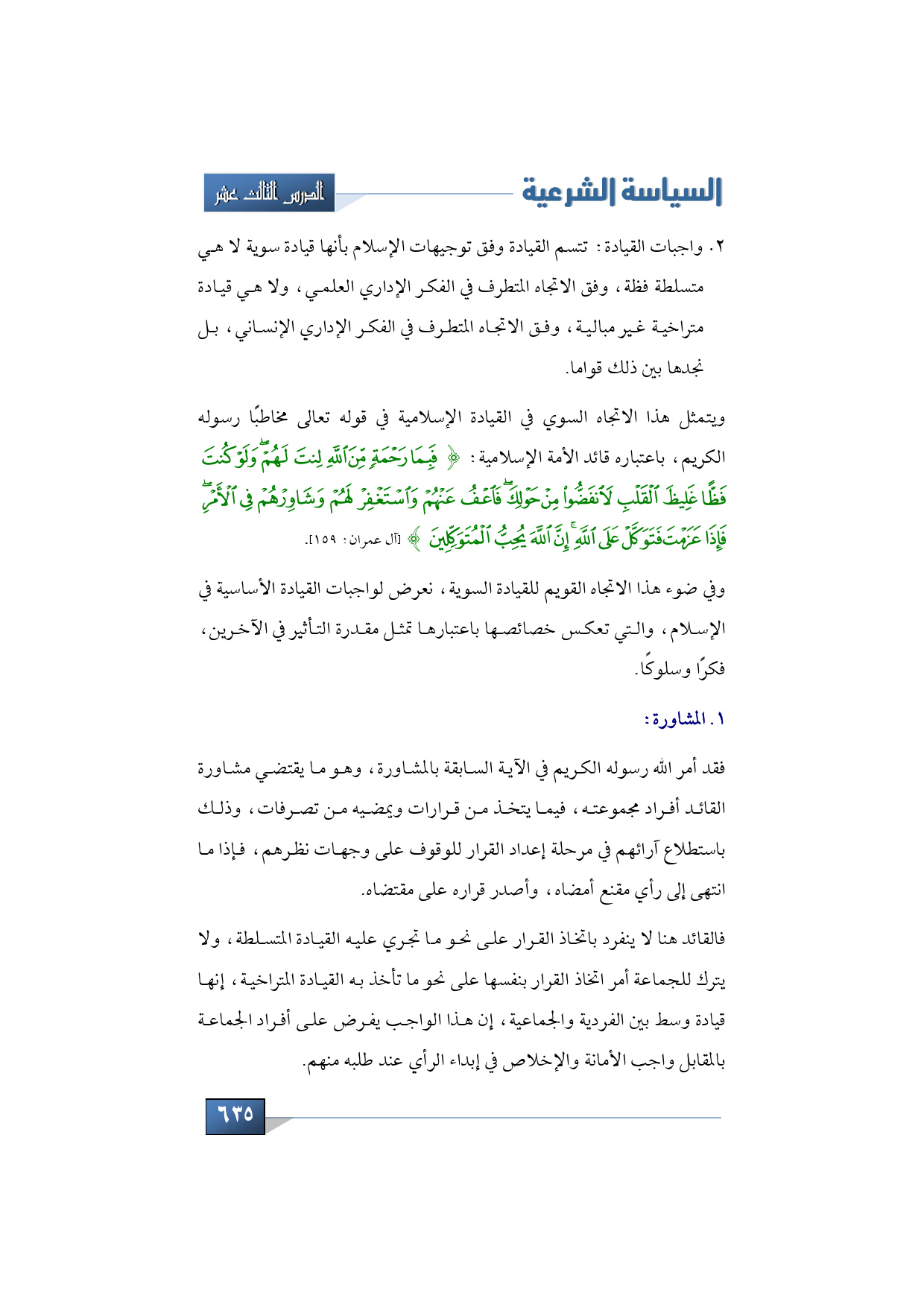 المشاورة فقد أمر الله رسوله الكريم في الآية السابقة بالمشاورة، وهو ما يقتضي مشاورة القائد أفراد مجموعته، فيما يتخذ من قرارات ويمضيه من تصرفات، وذلك باستطلاع آرائهم في مرحلة إعداد القرار للوقوف على وجهات نظرهم، فإذا ما انتهى إلى رأي مقنع أمضاه، وأصدر قراره على مقتضاه، فالقائد هنا لا ينفرد باتخاذ القرار على نحو ما تجري عليه القيادة المتسلطة، ولا يترك للجماعة أمر اتخاذ القرار بنفسها على نحو ما تأخذ به القيادة المتراخية، إنها قيادة وسط بين الفردية والجماعية، إن هذا الواجب يفرض على أفراد الجماعة بالمقابل واجب الأمانة والإخلاص في إبداء الرأي عند طلبه منهم.
