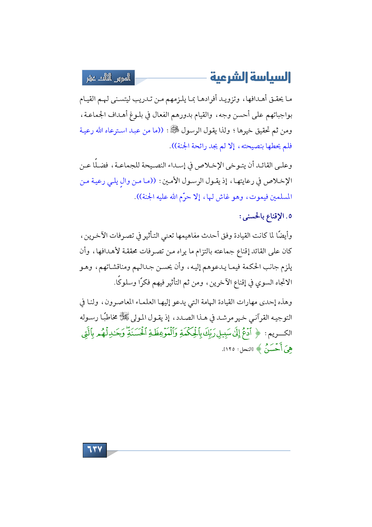 الإقناع بالحسنى: وأيضًا لما كانت القيادة وفق أحدث مفاهيمها تعني التأثير في تصرفات الآخرين، كان على القائد إقناع جماعته بالتزام ما يراه من تصرفات محققة لأهدافها، وأن يلزم جانب الحكمة فيما يدعوهم إليه، وأن يحسن جدالهم ومناقشاتهم، وهو الاتجاه السوي في إقناع الآخرين، ومن ثم التأثير فيهم فكرًا وسلوكًا، وهذه إحدى المهارات القيادة الهامة التي يدعو إليها العلماء المعاصرون، ولنا في التوجيه القرآني خير مرشد في هذا الصدد، إذ يقول المولى -سبحانه وتعالى- مخاطبًا رسوله الكريم: {ادْعُ إِلَى سَبِيلِ رَبِّكَ بِالْحِكْمَةِ وَالْمَوْعِظَةِ الْحَسَنَةِ وَجَادِلْهُمْ بِالَّتِي هِيَ أَحْسَنُ} (النحل: من الآية: 125).