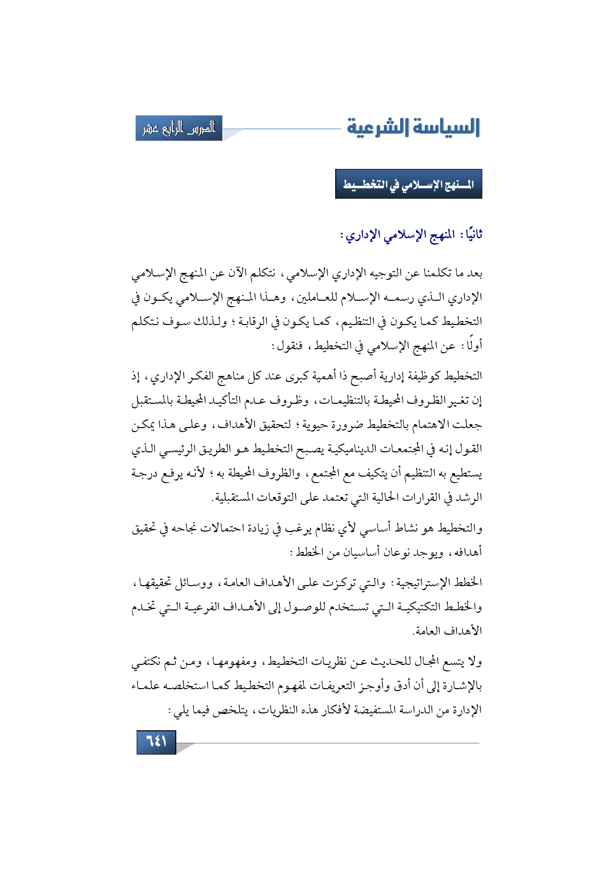 وبعد ما تكلمنا عن التوجيه الإداري الإسلامي، نتكلم الآن عن المنهج الإسلامي الإداري الذي رسمه الإسلام للعاملين، وهذا المنهج الإسلامي يكون في التخطيط كما يكون في التنظيم، كما يكون في الرقابة؛ ولذلك سوف نتكلم أولًا: عن المنهج الإسلامي في التخطيط، فنقول التخطيط كوظيفة إدارية أصبح ذا أهمية كبرى عند كل مناهج الفكر الإداري، إذ أن تغير الظروف المحيطة بالتنظيمات، وظروف عدم التأكيد المحيطة بالمستقبل جعلت الاهتمام بالتخطيط ضرورة حيوية؛ لتحقيق الأهداف، وعلى هذا يمكن القول إنه في المجتمعات الديناميكية يصبح التخطيط هو الطريق الرئيسي الذي يستطيع به التنظيم أن يتكيف مع المجتمع، والظروف المحيطة به؛ لأنه يرفع درجة الرشد في القرارات الحالية التي تعتمد على التوقعات المستقبلية.