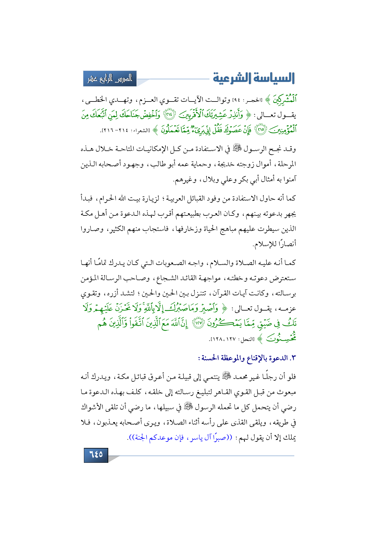 وثالث المعالم للتخطيط لنشر الدعوة الإسلامية: الدعوة بالإقناع والموعظة الحسنة، فلو أن رجلًا غير محمد -صلى الله عليه وسلم- ينتمي إلى قبيلة من أعرق قبائل مكة، ويدرك أنه مبعوث من قبل القوي القاهر لتبليغ رسالته إلى خلقه، كلف بهذه الدعوة ما رضي أن يتحمل كل ما تحمله الرسول -صلى الله عليه وسلم- في سبيلها، ما رضي أن تلقى الأشواك في طريقه، ويلقى القذى على رأسه أثناء الصلاة، ويرى أصحابه يعذبون، فلا يملك إلا أن يقول لهم: ((صبرًا آل ياسر، فإن موعدكم الجنة))