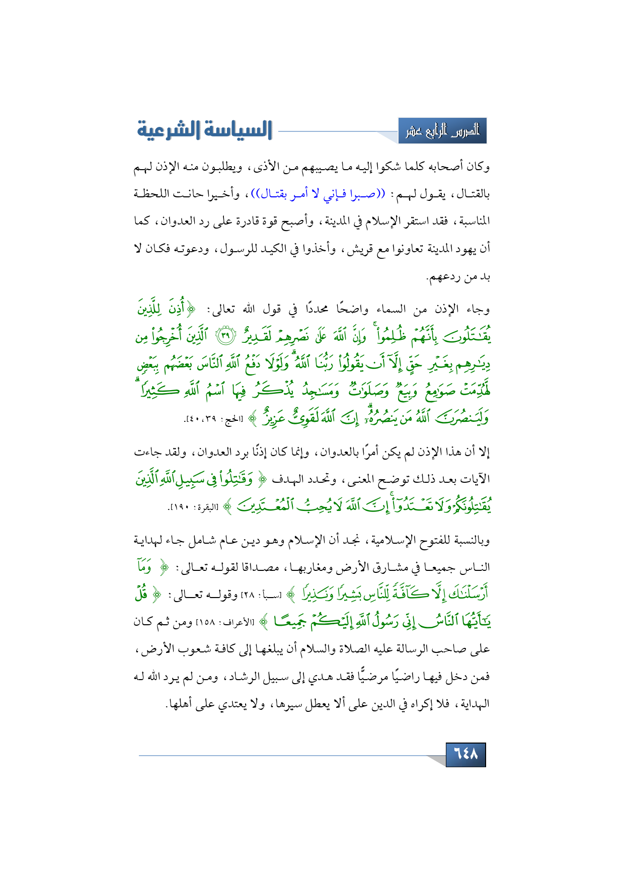 وكان أصحابه كلما شكوا إليه ما يصيبهم من الأذى، ويطلبون منه الإذن لهم بالقتال، يقول: لهم صبرا فإني لا أمر بقتال، وأخيرا حانت اللحظة المناسبة، فقد استقر الإسلام في المدينة، وأصبح قوة قادرة على رد العدوان، كما أن يهود المدينة تعاونوا مع قريش، وأخذوا في الكيد للرسول، ودعوته فكان لا بد من ردعهم، وجاء الإذن من السماء واضح محددًا في قول الله تعالى: {أُذِنَ لِلَّذِينَ يُقَاتَلُونَ بِأَنَّهُمْ ظُلِمُوا وَإِنَّ اللَّهَ عَلَى نَصْرِهِمْ لَقَدِيرٌ الَّذِينَ أُخْرِجُوا مِنْ دِيَارِهِمْ بِغَيْرِ حَقٍّ إِلاَّ أَنْ يَقُولُوا رَبُّنَا اللَّهُ وَلَوْلا دَفْعُ اللَّهِ النَّاسَ بَعْضَهُمْ بِبَعْضٍ لَهُدِّمَتْ صَوَامِعُ وَبِيَعٌ وَصَلَوَاتٌ وَمَسَاجِدُ يُذْكَرُ فِيهَا اسْمُ اللَّهِ كَثِيرًا وَلَيَنصُرَنَّ اللَّهُ مَنْ يَنصُرُهُ إِنَّ اللَّهَ لَقَوِيٌّ عَزِيزٌ} (الحج: الآيتان 40،39).