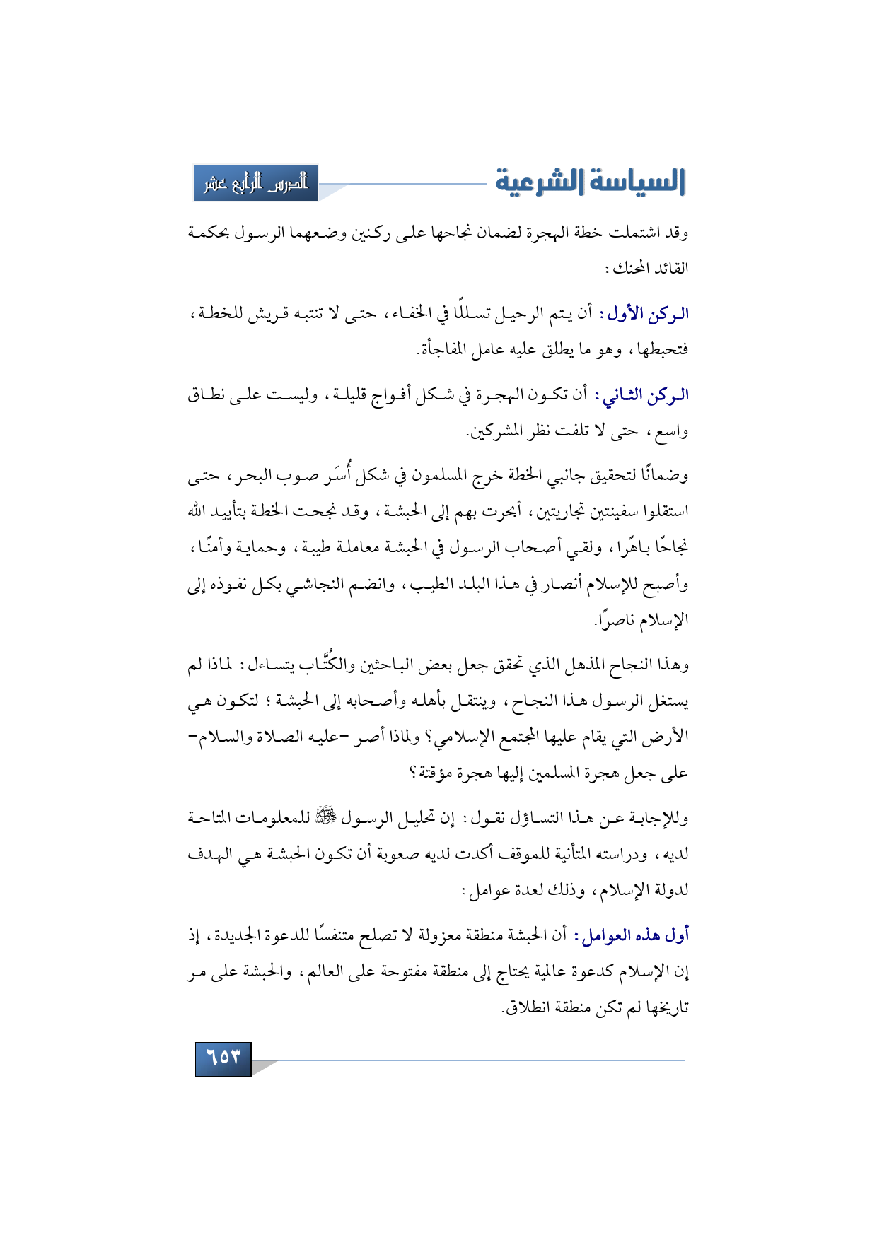الركن الثاني: أن تكون الهجرة في شكل أفواج قليلة، وليست على نطاق واسع، حتى لا تلفت نظر المشركين، وضمانًا لتحقيق جانبي الخطة، وضمانًا لتحقيق جانبي الخطة، وضمانا لتحقيق جانبي الخطة خرج المسلمون في شكل أسر صوب البحر، حتى استقلوا سفينتين تجاريتين، أبحرت بهم إلى الحبشة، وقد نجحت الخطة بتأييد الله نجاحا باهرا، ولقي أصحاب الرسول في الحبشة معاملة طيبة، وحماية وأمنا وأصبح للإسلام أنصار في هذا البلد الطيب، وانضم النجاشي بكل نفوذه إلى الإسلام ناصرا، وهذا النجاح المذهل الذي تحقق جعل بعض الباحثين، والكتاب يتساءل لماذا لم يستغل الرسول هذا النجاح، وينتقل بأهله وأصحابه إلى الحبشة؛ لتكون هي الأرض التي يقام عليها المجتمع الإسلامي؟ ولماذا أصر -عليه الصلاة والسلام- على جعل هجرة المسلمين إليها هجرة مؤقتة؟