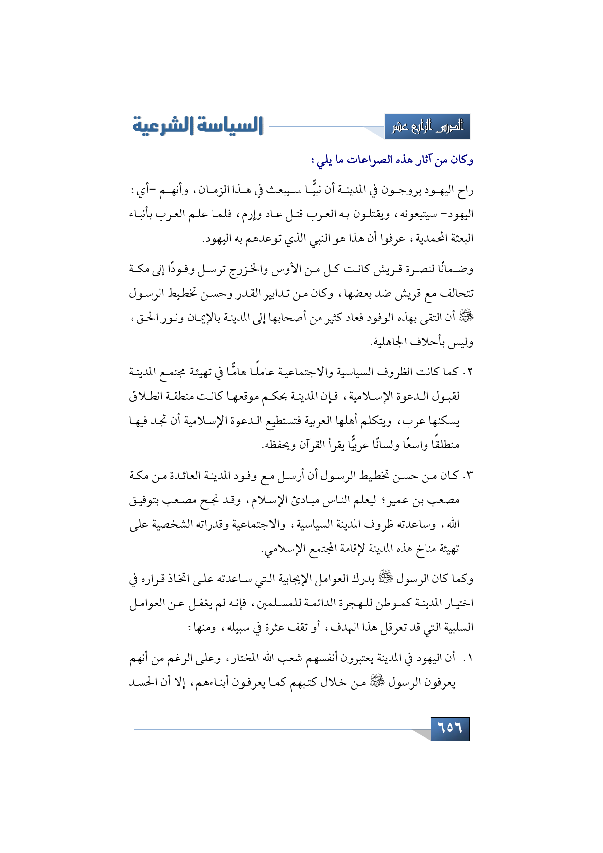 2 - كما كانت الظروف السياسية والاجتماعية عاملا هاما في تهيئة مجتمع المدينة لقبول الدعوة الإسلامية، فإن المدينة بحكم موقعها كانت منطقة انطلاق يسكنها عرب، ويتكلم أهلها العربية فتستطيع الدعوة الإسلامية أن تجد فيها منطلقا واسعا ولسانا عربيًّا يقرأ القرآن ويحفظه.