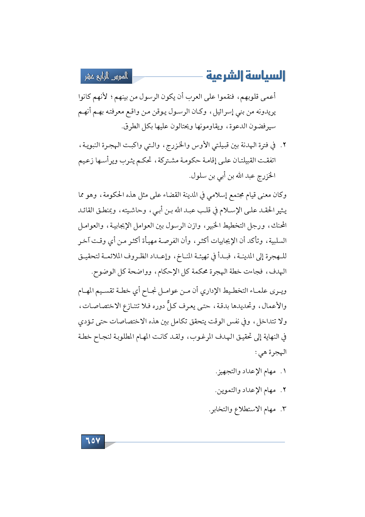 2 - في فترة الهدنة بين قبيلتي الأوس والخزرج، والتي واكبت الهجرة النبوية، اتفقت القبيلتان على إقامة حكومة مشتركة، تحكم يثرب ويرأسها زعيم الخزرج عبد الله بن أبي ابن سلول، وكان معنى قيام مجتمع إسلامي في المدينة القضاء على مثل هذه الحكومة، وهو مما يثير الحقد على الإسلام في قلب عبد الله بن أبي، وحاشيته، وبمنطق القائد المحنك، ورجل التخطيط الخبير، وازن الرسول بين العوامل الإيجابية، والعوامل السلبية، وتأكد أن الإيجابيات أكثر، وأن الفرصة مهيأة أكثر من أي وقت آخر للهجرة إلى المدينة، فبدأ في تهيئة المناخ، وإعداد الظروف الملائمة لتحقيق الهدف، فجاءت خطة الهجرة محكمة كل الإحكام، وواضحة كل الوضوح.