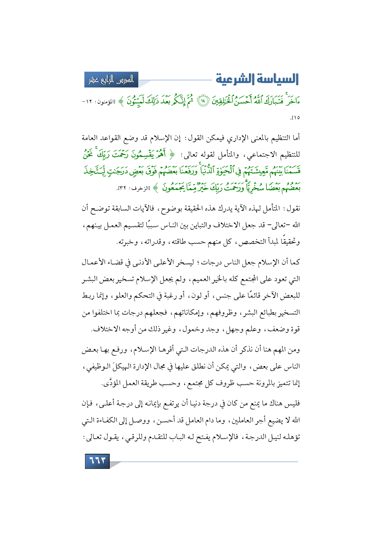 أما التنظيم بالمعنى الإداري: فيمكن القول: إن الإسلام قد وضع القواعد العامة للتنظيم الاجتماعي, والمتأمل لقوله تعالى: {أَهُمْ يَقْسِمُونَ رَحْمَةَ رَبِّكَ نَحْنُ قَسَمْنَا بَيْنَهُمْ مَعِيشَتَهُمْ فِي الْحَيَاةِ الدُّنْيَا وَرَفَعْنَا بَعْضَهُمْ فَوْقَ بَعْضٍ دَرَجَاتٍ لِيَتَّخِذَ بَعْضُهُمْ بَعْضًا سُخْرِيًّا وَرَحْمَةُ رَبِّكَ خَيْرٌ مِمَّا يَجْمَعُونَ} (الزخرف: 32) نقول: المتأمل لهذه الآية يدرك هذه الحقيقة بوضوح, فالآيات السابقة توضح أن الله -تعالى- قد جعل الاختلاف والتباين بين الناس سببًا لتقسيم العمل بينهم, وتحقيقًا لمبدأ التخصص, كل منهم حسب طاقته, وقدراته, وخبرته, كما أن الإسلام جعل الناس درجات؛ ليسخر الأعلى الأدنى في قضاء الأعمال التي تعود على المجتمع كله بالخير العميم, ولم يجعل الإسلام تسخير بعض البشر للبعض الآخر, لم يجعل هذا التسخير قائمًا على جنس, أو لون, أو رغبة في التحكم والعلو, وإنما ربط التسخير بطبائع البشر, وظروفهم, وإمكاناتهم, فجعلهم درجات بما اختلفوا من قوة وضعف, وعلم وجهل, وجد وخمول, وغير ذلك من أوجه الاختلاف.