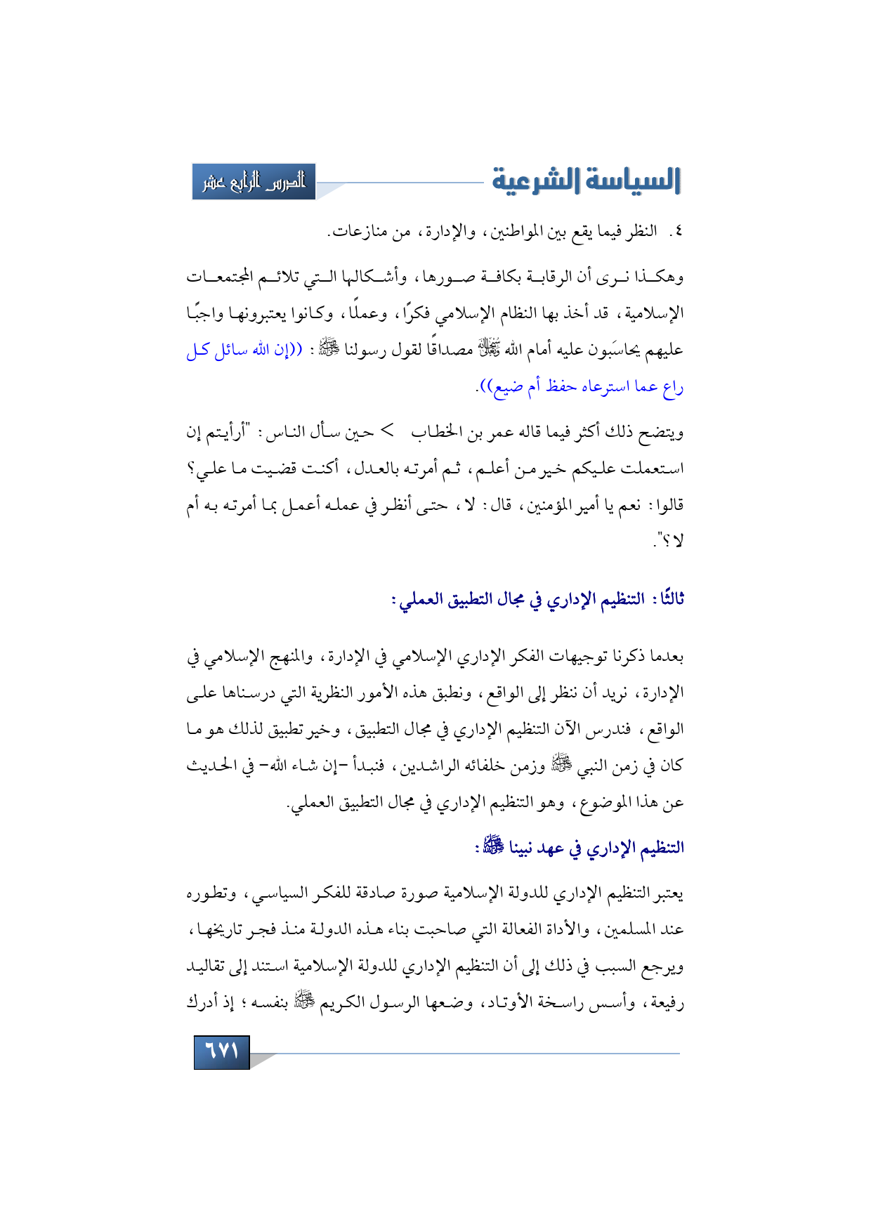 ونبدأ الآن في التنظيم الإداري في عهد نبينا -صلى الله عليه وسلم- فنقول: