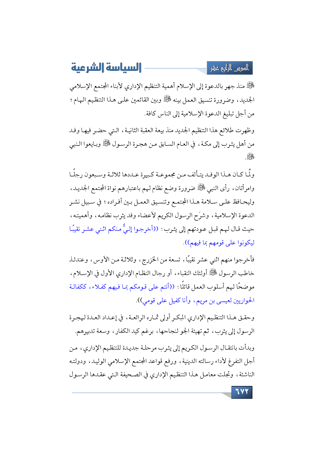 -عليه الصلاة والسلام- منذ جهر بالدعوة إلى الإسلام, أدرك أهمية التنظيم الإداري لأبناء المجتمع الإسلامي الجديد, وضرورة تنسيق العمل بينه -عليه الصلاة والسلام- وبين القائمين على هذا التنظيم الهام؛ من أجل تبليغ الدعوة الإسلامية إلى الناس كافة, وظهرت طلائع هذا التنظيم الجديد منذ بيعة العقبة الثانية, التي حضر فيها وفد من أهل يثرب إلى مكة, في العام السابق من هجرة الرسول -صلى الله عليه وسلم- وبايعوا النبي -صلى الله عليه وسلم- ولمَّا كان هذا الوفد يتألف من مجموعة كبيرة عددها ثلاثة وسبعون رجلًا وامرأتان, رأى النبي -صلى الله عليه وسلم- ضرورة وضع نظام لهم باعتبارهم نواة المجتمع الجديد, وليحافظ على سلامة هذا المجتمع وتنسيق العمل بين أفراده في سبيل نشر الدعوة الإسلامية, وشرَح الرسول الكريم لأعضاء وفد يثرب نظامه, وأهميته, حيث قال لهم قبل عودتهم إلى يثرب: ((أخرجوا إليًّ منكم اثنى عشر نقيبًا ليكونوا على قومهم بما فيهم)) فأخرجوا منهم اثني عشر نقيبًا, تسعة من الخزرج, وثلاثة من الأوس, وعندئذ خاطب الرسول -صلى الله عليه وسلم- أولئك النقباء, أو رجال النظام الإداري الأول في الإسلام, موضحًا لهم أسلوب العمل قائلًا: أنتم على قومكم بما فيهم كفلاء, ككفالة الحواريين لعيسى بن مريم, وأنا كفيل على قومي.