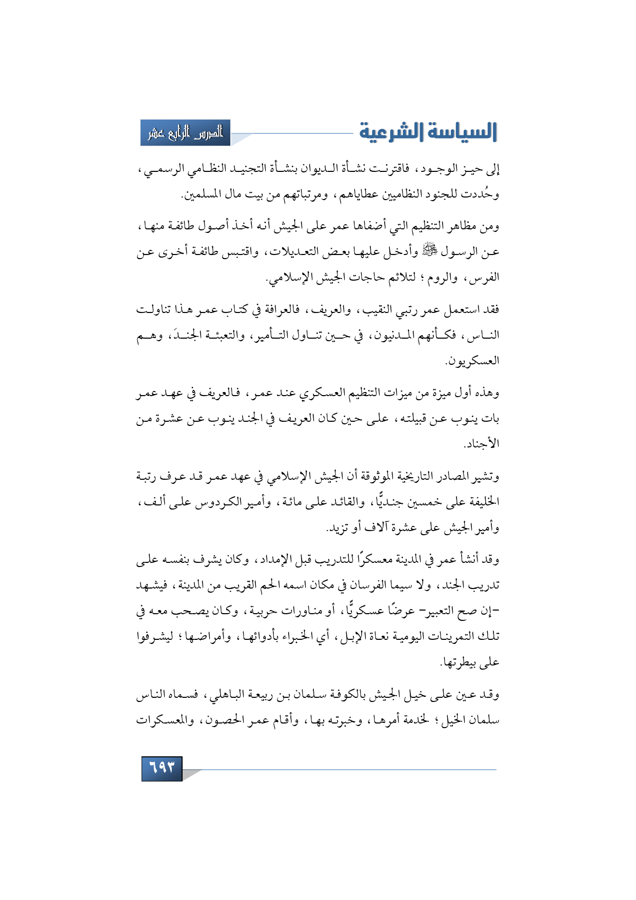 ومن مظاهر التنظيم التي أضفاها عمر على الجيش انه أخذ أصول طائفة منها, عن الرسول -صلى الله عليه وسلم- وأدخل عليها بعض التعديلات, واقتبس طائفة أخرى عن الفرس, والروم؛ لتلائم حاجات الجيش الإسلامي, فقد استعمل عمر رتبي النقيب, والعريف, فالعرافة في كتاب عمر هذا تناولت الناس, فكأنهم المدنيون, في حين تناول التأمير, والتعبئة الجندَ, وهم العسكريون, وهذه أول ميزة من ميزات التنظيم العسكري عند عمر, فالعريف في عهد عمر بات ينوب عن قبيلته, على حين كان العريف في الجند ينوب عن عشرة من الأجناد, وتشير المصادر التاريخية الموثوقة أن الجيش الإسلامي في عهد عمر قد عرف رتبة الخليفة على خمسين جنديًّا, والقائد على مائة, وأمير الكردوس على ألف, وأمير الجيش على عشرة آلاف أو تزيد, وقد أنشأ عمر في المدينة معسكرًا للتدريب قبل الإمداد, وكان يشرف بنفسه على تدريب الجند, ولا سيما الفرسان في مكان اسمه الحم القريب من المدينة, فيشهد -إن صح التعبير- عرضًا عسكريًّا, أو مناورات حربية, وكان يصحب معه في تلك التمرينات اليومية نعاة الإبل, أي الخبراء بأدوائها, وأمراضها؛ ليشرفوا على بيطرتها.