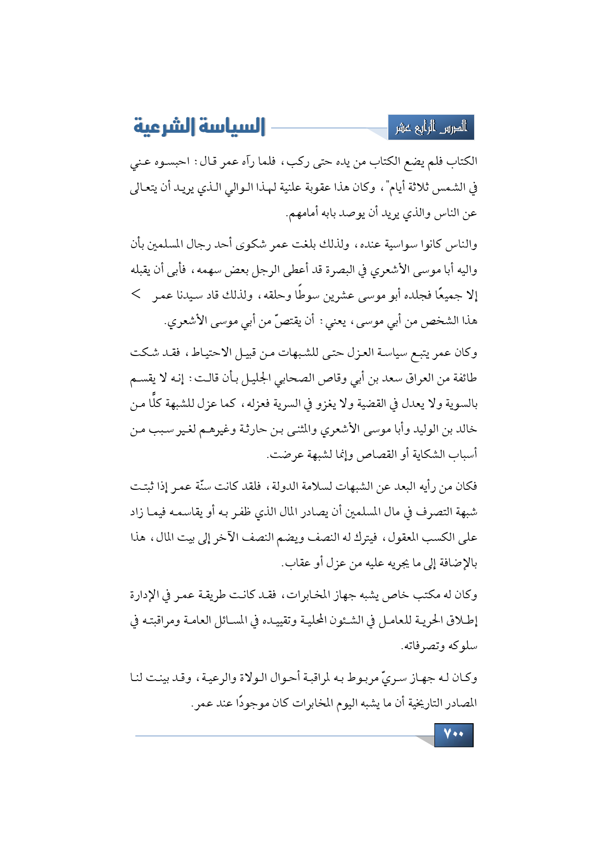 الكتاب فلم يضع الكتاب من يده حتى ركب، فلما رآه عمر قال: احبسوه عني في الشمس ثلاثة أيام، وكان هذا عقوبة علنية لهذا الوالي الذي يريد أن يتعالى عن الناس والذي يريد أن يوصد بابه أمامهم، والناس كانوا سواسية عنده، ولذلك بلغت عمر شكوى أحد رجال المسلمين بأن واليه أبا موسى الأشعري في البصرة قد أعطى الرجل بعض سهمه فأبى أن يقبله إلا جميعًا فجلده أبو موسى عشرين سوطًا وحلقه، ولذلك سيدنا عمر -رضوان الله تبارك وتعالى عليه- قاد هذا الشخص من أبي موسى يعني: ما فعله أبي موسى في هذا الشخص أمر عمر بن الخطاب المفعول به ذلك أن يقتصّ من أبي موسى الأشعري.