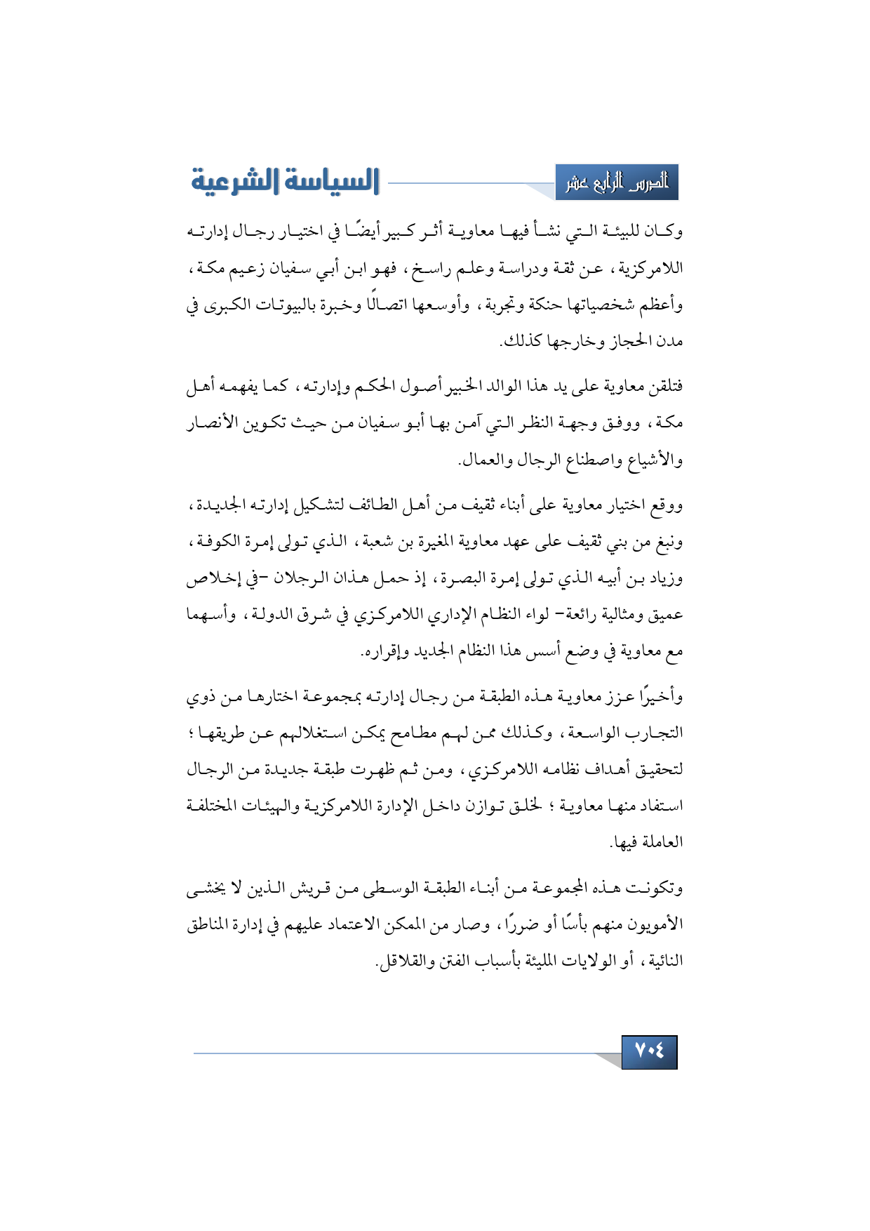 ووقع اختيار معاوية على أبناء ثقيف من أهل الطائف لتشكيل إدارته الجديدة، ونبغ من بني ثقيف على عهد معاوية المغيرة بن شعبة الذي تولى إمرة الكوفة، وزياد بن أبيه الذي تولى إمرة البصرة، إذ حمل هذان الرجلان في إخلاص عميق ومثالية رائعة لواء النظام الإداري اللامركزي في شرق الدولة، وأسهما مع معاوية في وضع أسس هذا النظام الجديد وإقراره، وأخيرًا عزز معاوية هذه الطبقة من رجال إدارته بمجموعة اختارها من ذوي التجارب الواسعة وكذلك ممن لهم مطامح يمكن استغلالهم عن طريقها؛ لتحقيق أهداف نظامه اللامركزي، ومن ثم ظهرت طبقة جديدة من الرجال استفاد منها معاوية لخلق توازن داخل الإدارة اللامركزية والهيئات المختلفة العاملة فيها، وتكونت هذه المجموعة من أبناء الطبقة الوسطى من قريش الذين لا يخشى الأمويون منهم بأسًا أو ضررًا، وصار من الممكن الاعتماد عليهم في إدارة المناطق النائية أو الولايات المليئة بأسباب الفتن والقلاقل.