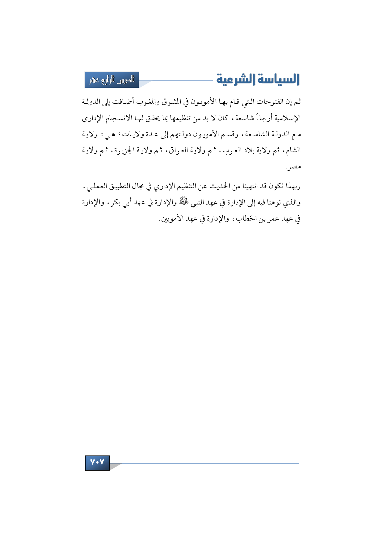 وبهذا نكون قد انتهينا من الحديث عن التنظيم الإداري في مجال التطبيق العملي، والذي نوهنا فيه إلى الإدارة في عهد النبي -صلى الله عليه وسلم- والإدارة في عهد أبي بكر، والإدارة في عهد عمر بن الخطاب، والإدارة في عهد الأمويين.