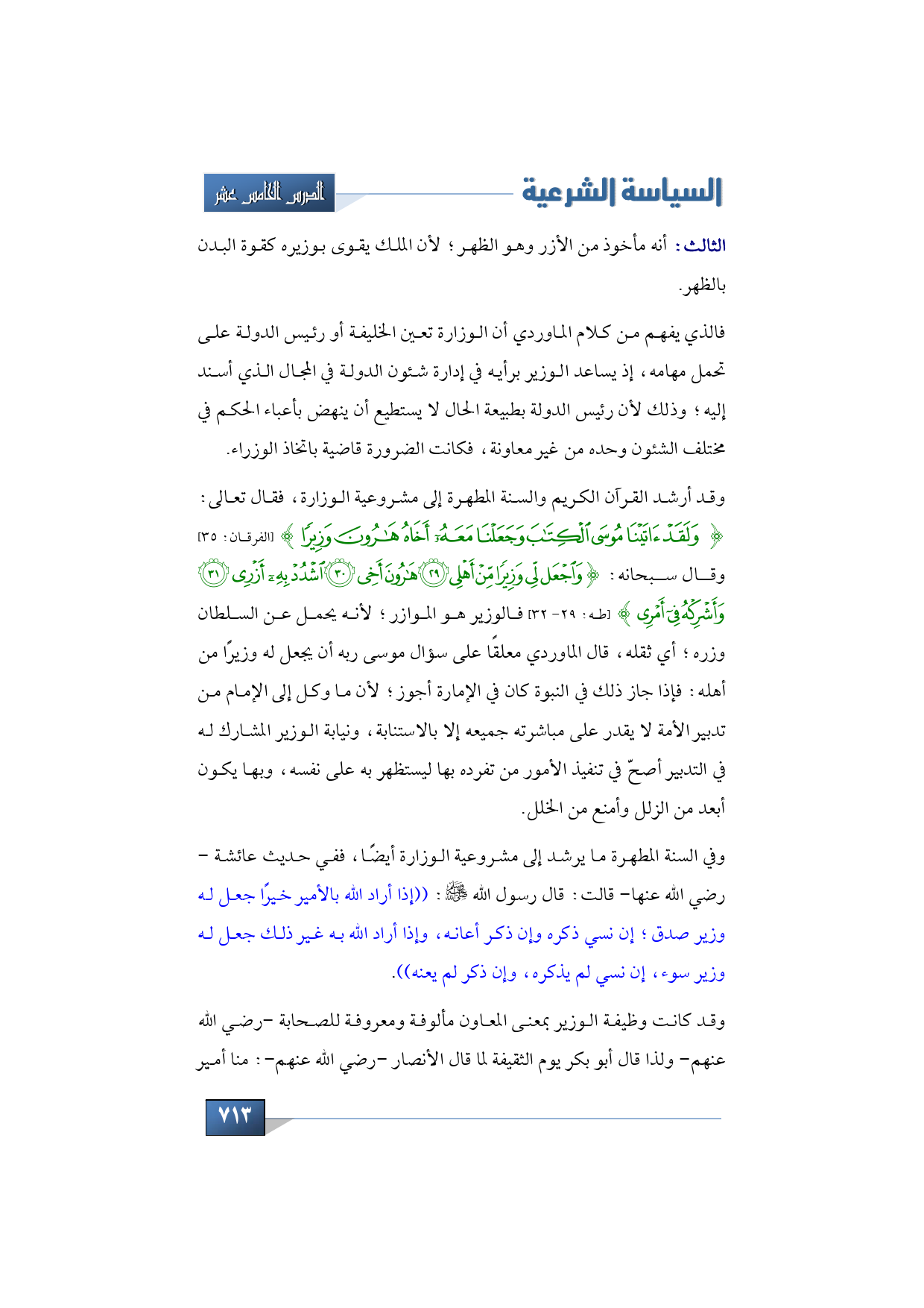 والثالث: أنه مأخوذ من الأزر وهو الظهر؛ لأن الملك يقوى بوزيره كقوة البدن بالظهر. فالذي يفهم من كلام الماوردي أن الوزارة تعين الخليفة أو رئيس الدولة على تحمل مهامه، إذ يساعد الوزير برأيه في إدارة شئون الدولة في المجال الذي أسند إليه؛ وذلك لأن رئيس الدولة بطبيعة الحال لا يستطيع أن ينهض بأعباء الحكم في مختلف الشئون وحده من غير معاونة فكانت الضرورة قاضية باتخاذ الوزراء.