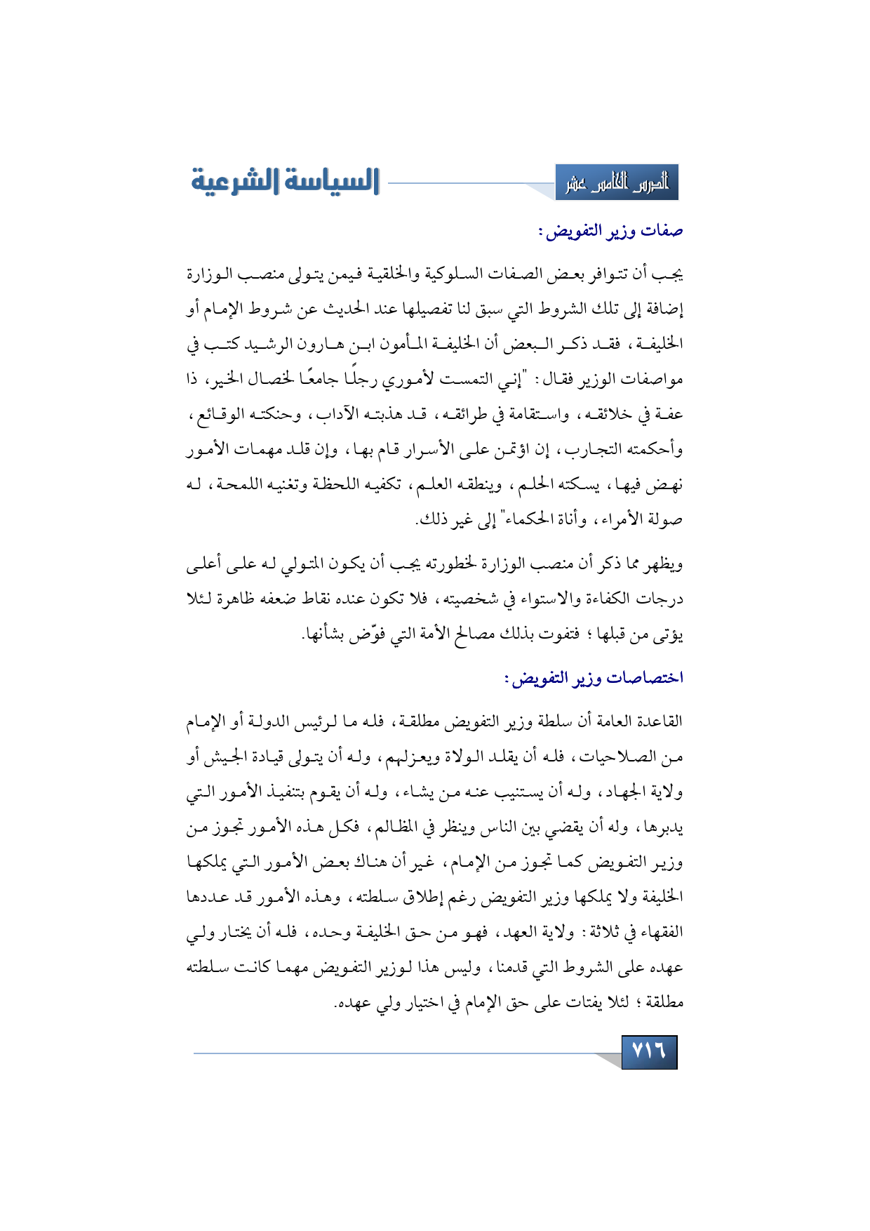 القاعدة العامة أن سلطة وزير التفويض مطلقة فله ما لرئيس الدولة أو الإمام من الصلاحيات، فله أن يقلد الولاة ويعزلهم، وله أن يتولى قيادة الجيش أو ولاية الجهاد، وله أن يستنيب عنه من يشاء، وله أن يقوم بتنفيذ الأمور التي يدبرها، وله أن يقضي بين الناس وينظر في المظالم، فكل هذه الأمور تجوز من وزير التفويض كما تجوز من الإمام، غير أن هناك بعض الأمور التي يملكها الخليفة ولا يملكها وزير التفويض رغم إطلاق سلطته، وهذه الأمور قد عددها الفقهاء في ثلاثة: ولاية العهد، فهو من حق الخليفة وحده فله أن يختار ولي عهده على الشروط التي قدمنا، وليس هذا لوزير التفويض مهما كانت سلطته مطلقة؛ لئلا يفتات على حق الإمام في اختيار ولي عهده.