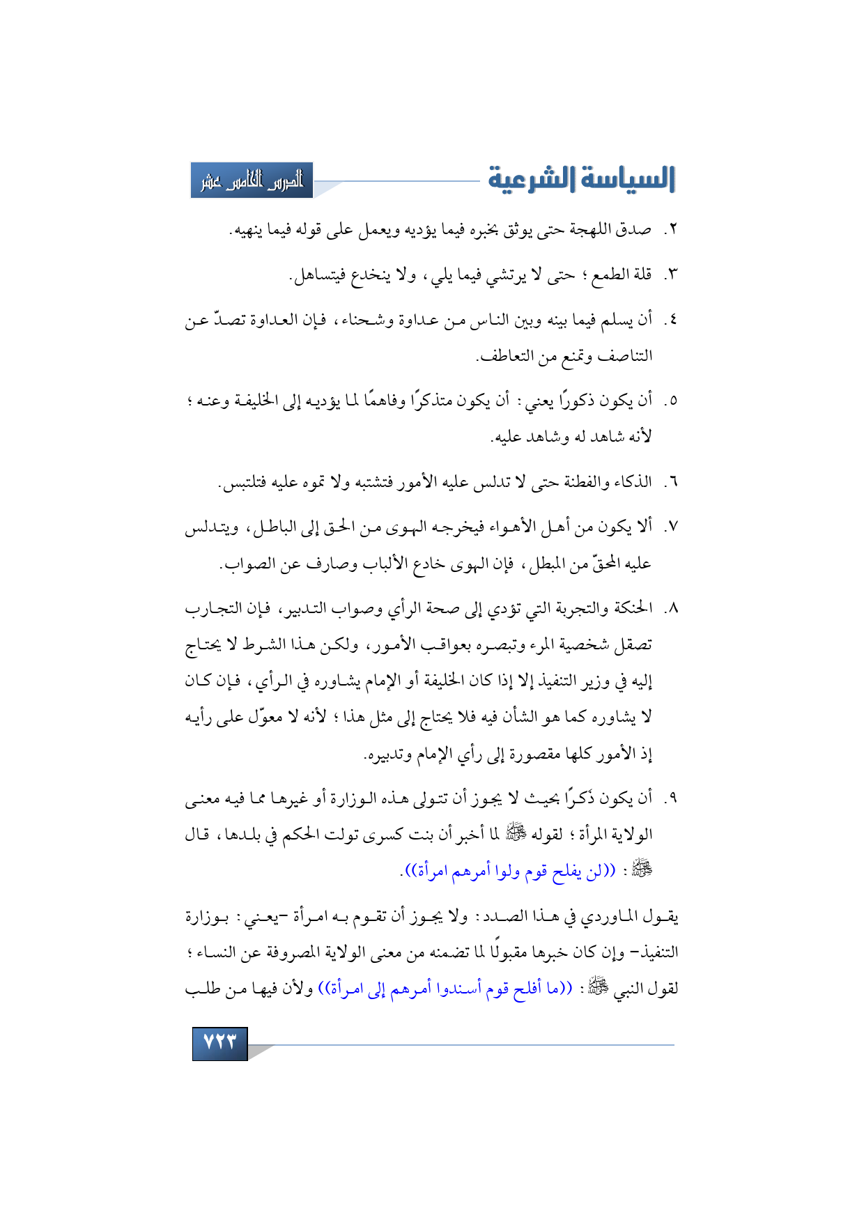 9 - أن يكون ذَكرًا بحيث لا يجوز أن تتولى هذه الوزارة أو غيرها مما فيه معنى الولاية المرأة؛ لقوله -صلى الله عليه وسلم- لما أخبر أن بنت كسرى تولت -يعني: تولت الحكم في بلدها- قال -صلى الله عليه وسلم-: ((لن يفلح قوم ولوا أمرهم امرأة)).