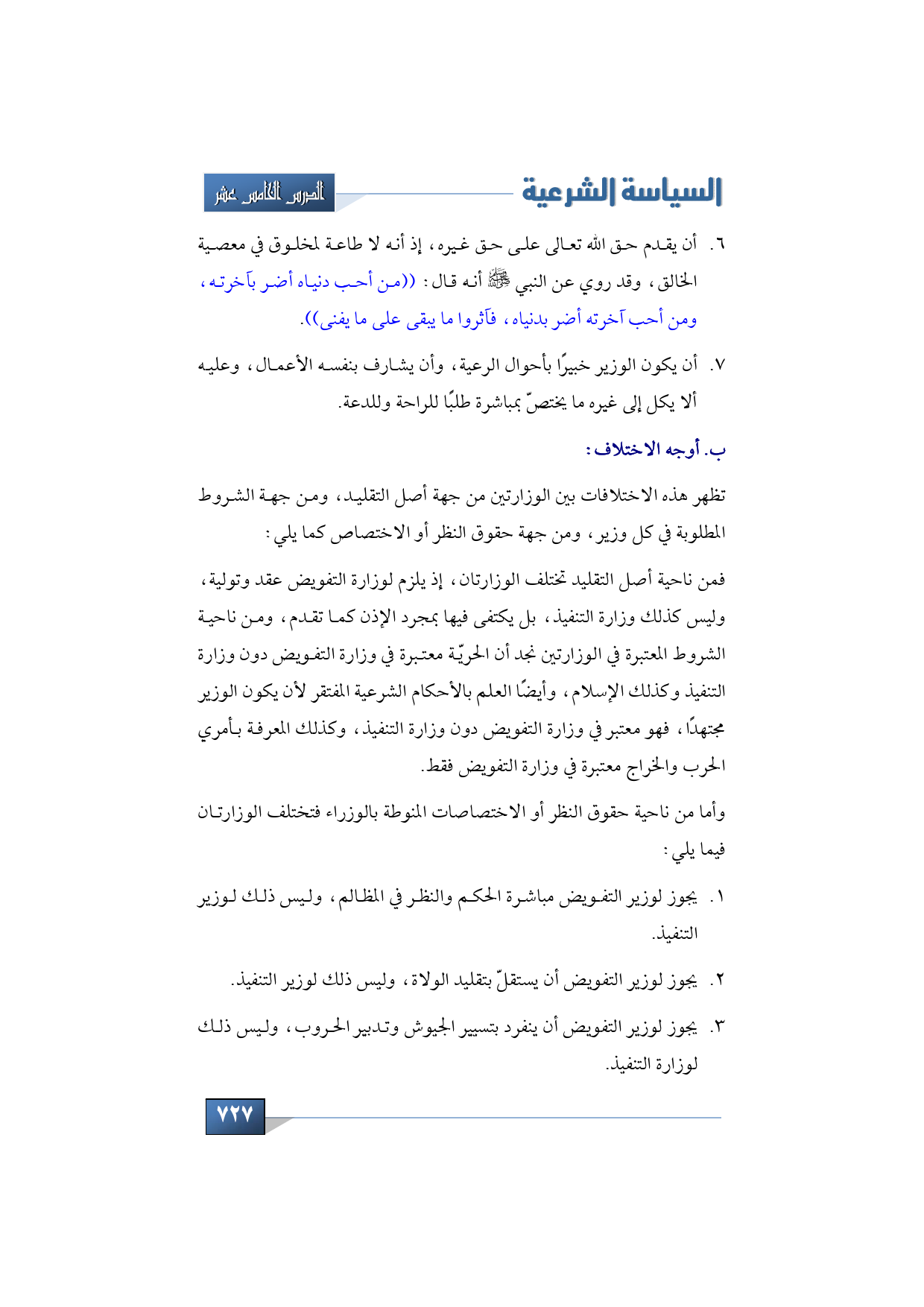 هذه هي الأمور التي تتفق فيها الوزارتان وزارة التفويض ووزارة التنفيذ، فكل هذه الأمور التي ذكرناها يجب أن يتصف بها وزير التفويض ويتصف بها أيضًا وزير التنفيذ.