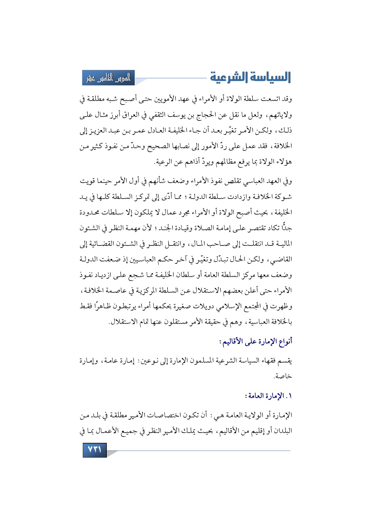 فقد تحدثنا في المحاضرة السابقة عن أنواع الوَزارة في النظام الإسلامي وقلنا إنها تنقسم إلى وزارة تفويض، ووزارة تنفيذ، وبينا شروط الوزير في الوزارتين، وبينا أيضًا أوجه الاتفاق والاختلاف بين الوزارتين، ثم بدأنا الحديث عن الإمارة على الأقاليم.