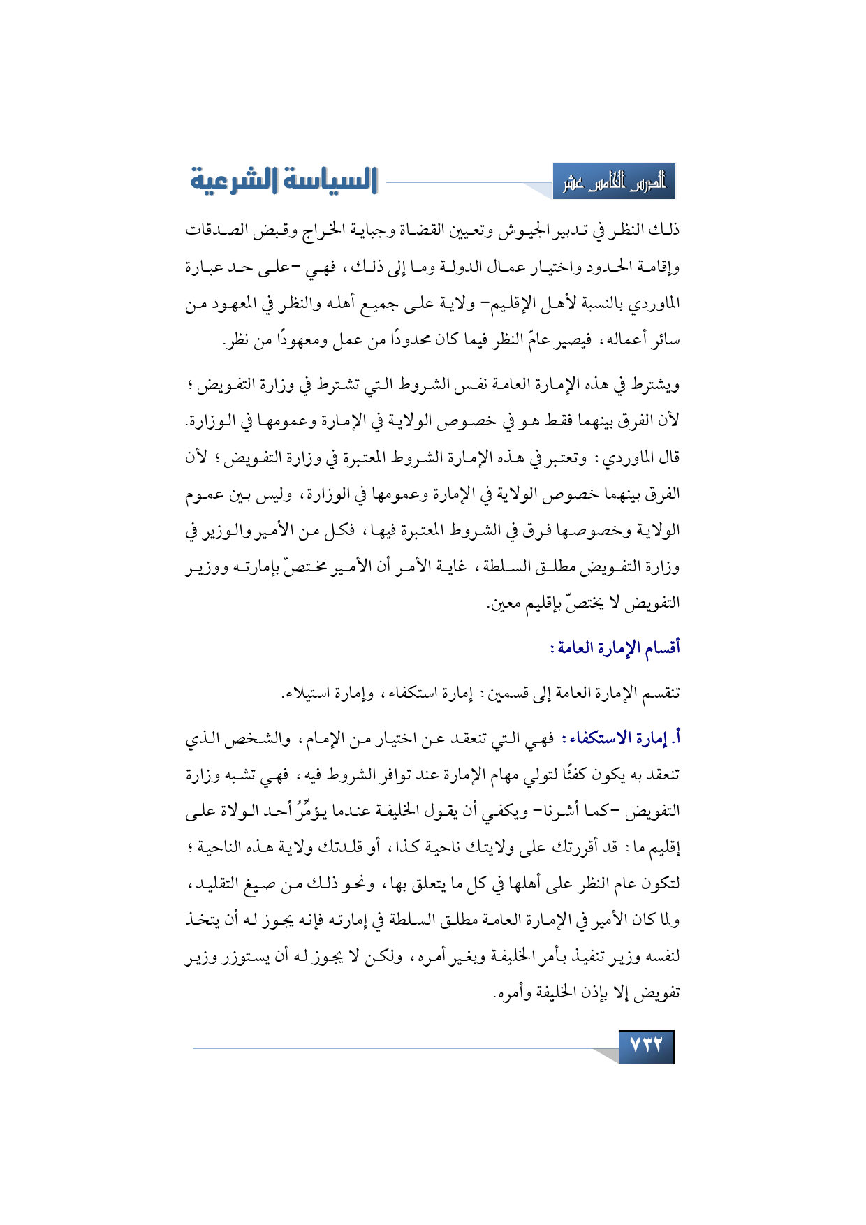 فنقول: تنقسم الإمارة العامة إلى قسمين: إمارة استكفاء، وإمارة استيلاء.