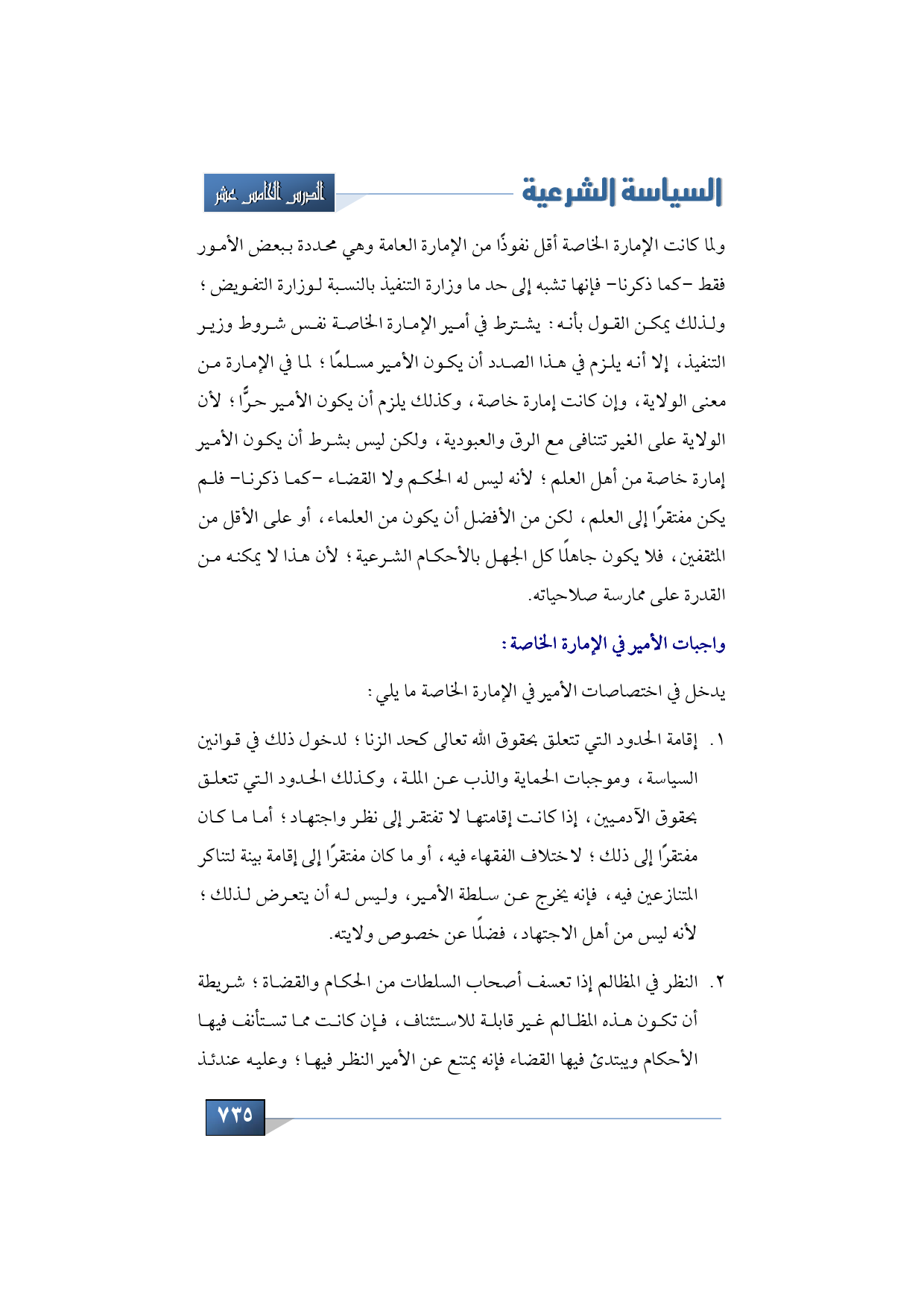 ولما كانت الإمارة الخاصة أقل نفوذًا من الإمارة العامة وهي محددة ببعض الأمور فقط -كما ذكرنا- فإنها تشبه إلى حد ما وزارة التنفيذ بالنسبة لوزارة التفويض؛ ولذلك يمكن القول بأنه: يشترط في أمير الإمارة الخاصة نفس شروط وزير التنفيذ، إلا أنه يلزم في هذا الصدد أن يكون الأمير مسلمًا؛ لما في الإمارة من معنى الولاية، وإن كانت إمارة خاصة، وكذلك يلزم أن يكون الأمير حرًّا؛ لأن الولاية على الغير تتنافى مع الرق والعبودية، ولكن ليس بشرط أن يكون الأمير إمارة خاصة من أهل العلم؛ لأنه ليس له الحكم ولا القضاء -كما ذكرنا- فلم يكن مفتقرًا إلى العلم، لكن من الأفضل أن يكون من العلماء، أو على الأقل من المثقفين، فلا يكون جاهلًا كل الجهل بالأحكام الشرعية؛ لأن هذا لا يمكنه من القدرة على ممارسة صلاحياته.