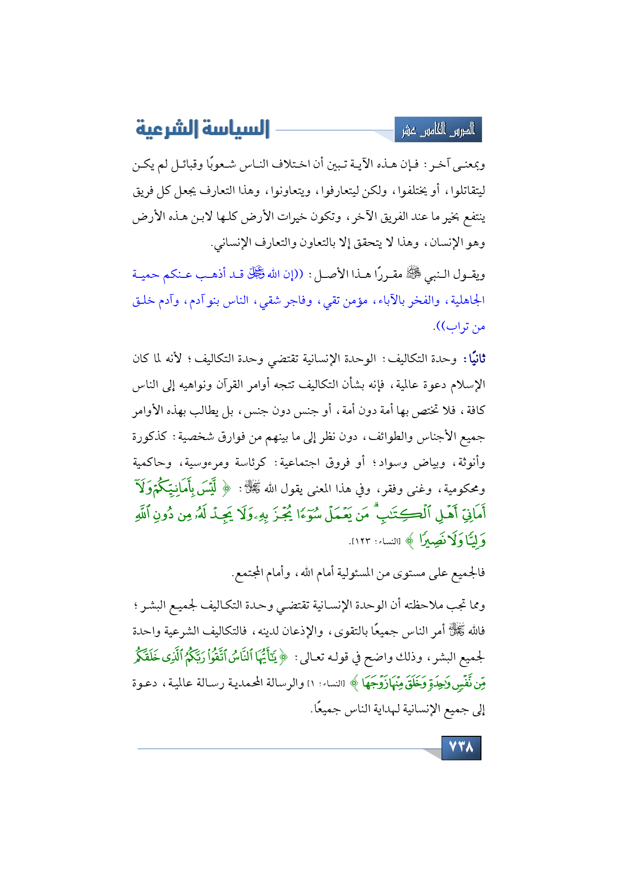 ومما تجب ملاحظته أن الوحدة الإنسانية تقتضي وحدة التكاليف لجميع البشر؛ فالله -سبحانه وتعالى- أمر الناس جميعًا بالتقوى، والإذعان لدينه، فالتكاليف الشرعية واحدة لجميع البشر، وذلك واضح في قوله تعالى: {يَا أَيُّهَا النَّاسُ اتَّقُوا رَبَّكُمُ الَّذِي خَلَقَكُمْ مِنْ نَفْسٍ وَاحِدَةٍ وَخَلَقَ مِنْهَا زَوْجَهَا} (النساء: من الآية: 1) والرسالة المحمدية رسالة عالمية، دعوة إلى جميع الإنسانية لهداية الناس جميعًا.