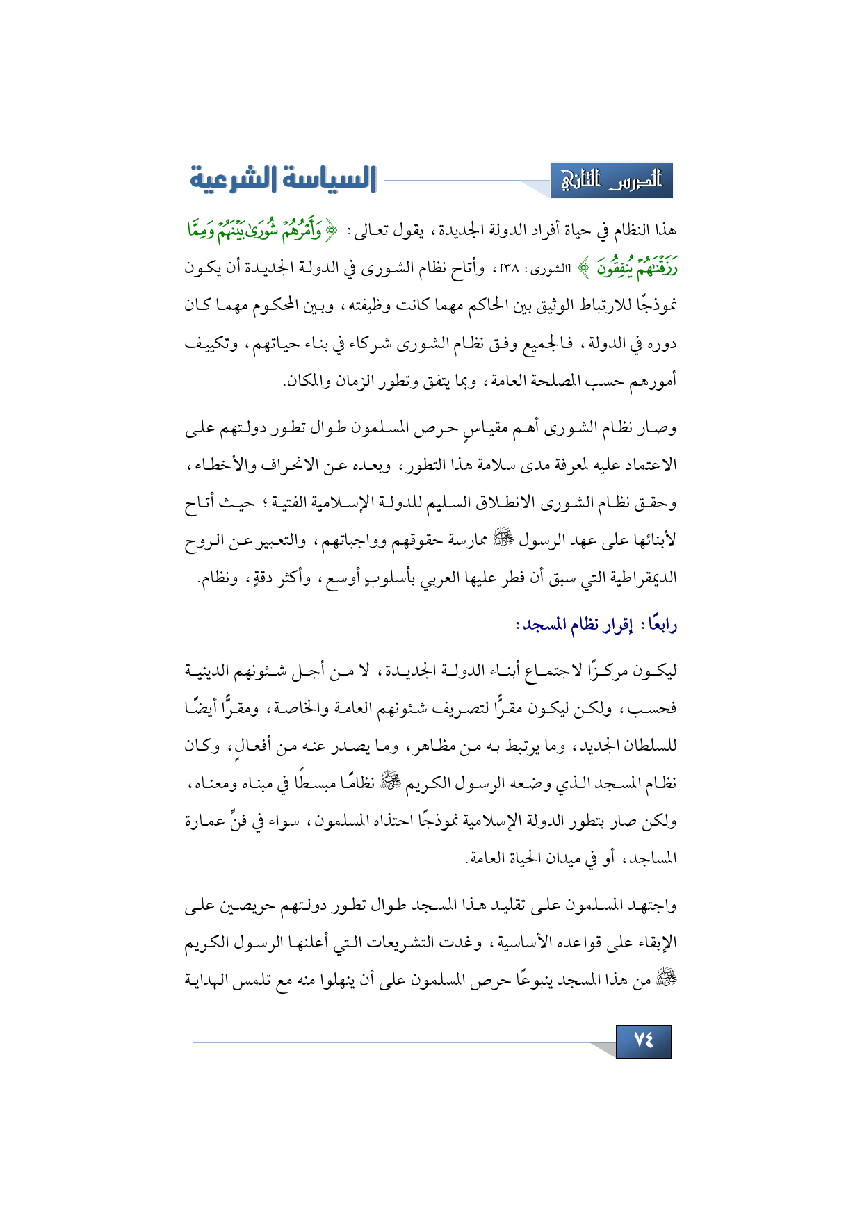 هذا النظام في حياة أفراد الدولة الجديدة يقول تعالى: {وَأَمْرُهُمْ شُورَى بَيْنَهُمْ وَمِمَّا رَزَقْنَاهُمْ يُنْفِقُونَ} (الشورى: من الآية: 38)، وأتاح نظام الشورى في الدولة الجديدة أن يكون نموذجًا للارتباط الوثيق بين الحاكم -مهما كانت وظيفته- وبين المحكوم مهما كان دوره في الدولة، فالجميع -وفق نظام الشورى- شركاء في بناء حياتهم، وتكييف أمورهم حسب المصلحة العامة، وبما يتفق وتطور الزمان والمكان.