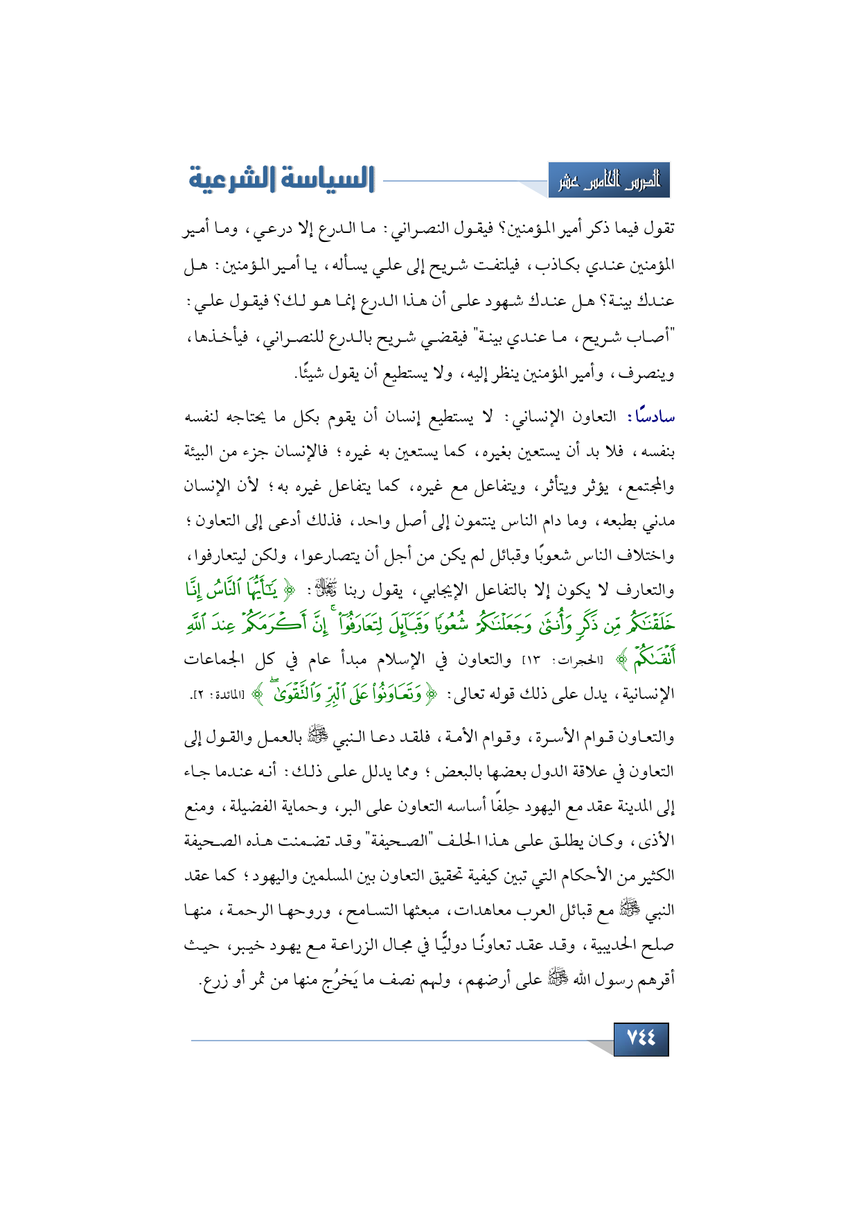 ومن المبادئ العامة أيضًا التي كان أساس العلاقة بين المسلمين وبين غيرهم هو: التعاون الإنساني، وفي ذلك نقول: