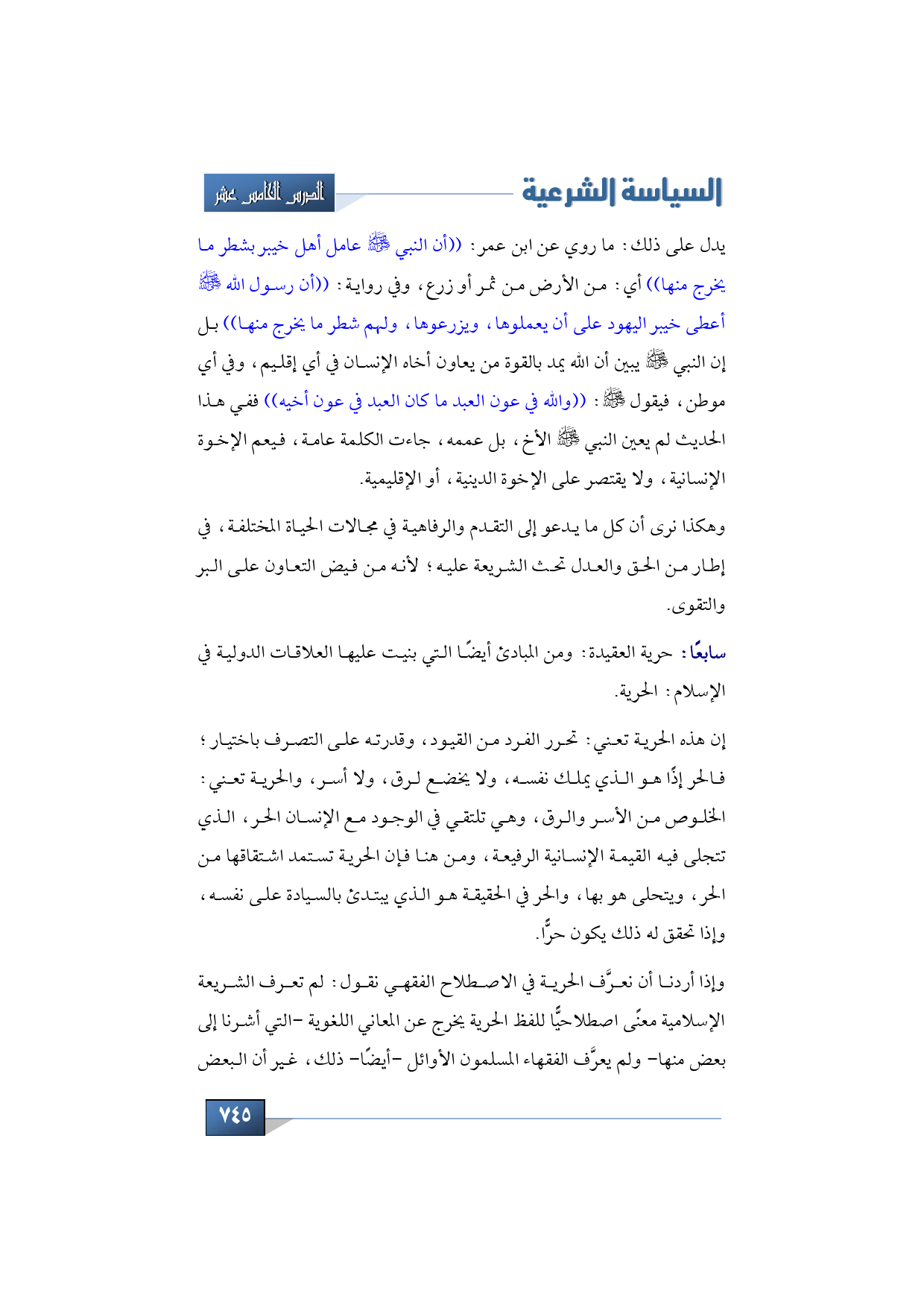 ومن المبادئ أيضًا التي بنيت عليها العلاقات الدولية في الإسلام: الحرية وفي ذلك نقول: