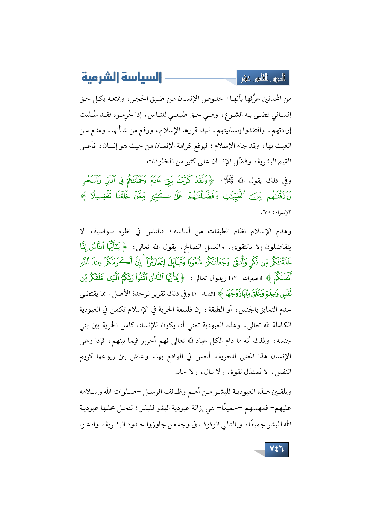 من المحدثين عرَّفها بأنها: خلوص الإنسان من ضيق الحجر، وتمتعه بكل حق إنساني قضى به الشرع، وهي حق طبيعي للناس، إذا حُرِموه فقد سُلبت إرادتهم، وافتقدوا إنسانيتهم، لهذا قررها الإسلام، ورفع من شأنها، ومنع من العبث بها، وقد جاء الإسلام؛ ليرفع كرامة الإنسان من حيث هو إنسان، فأعلى القيم البشرية، وفضّل الإنسان على كثير من المخلوقات.