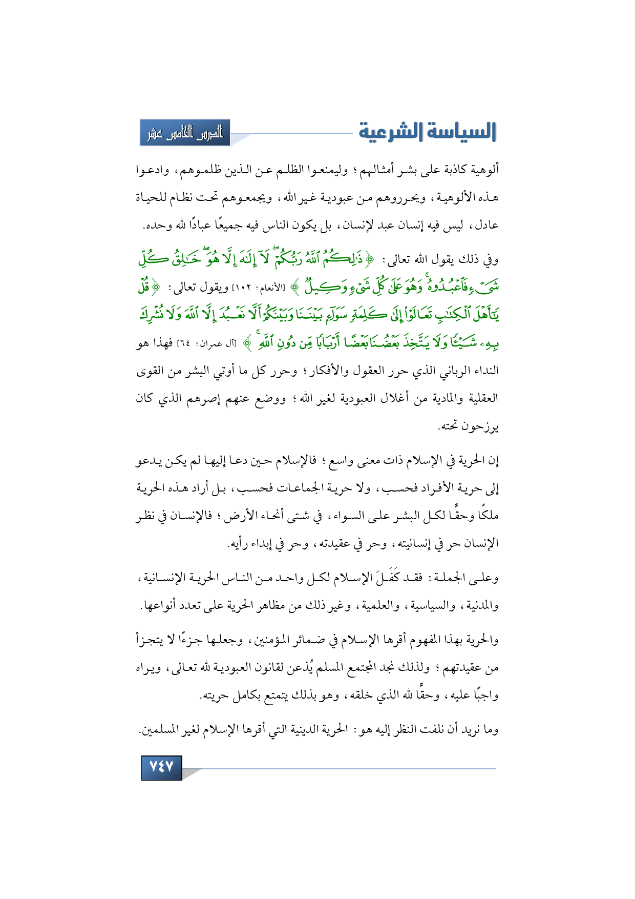 وفي ذلك يقول الله تعالى: {ذَلِكُمُ اللَّهُ رَبُّكُمْ لا إِلَهَ إِلاَّ هُوَ خَالِقُ كُلِّ شَيْءٍ فَاعْبُدُوهُ وَهُوَ عَلَى كُلِّ شَيْءٍ وَكِيلٌ} (الأنعام: 102) ويقول تعالى: {قُلْ يَا أَهْلَ الْكِتَابِ تَعَالَوْا إِلَى كَلِمَةٍ سَوَاءٍ بَيْنَنَا وَبَيْنَكُمْ أَلاَّ نَعْبُدَ إِلاَّ اللَّهَ وَلا نُشْرِكَ بِهِ شَيْئًا وَلا يَتَّخِذَ بَعْضُنَا بَعْضًا أَرْبَابًا مِنْ دُونِ اللَّهِ} (آل عمران: 64) فهذا هو النداء الرباني الذي حرر العقول والأفكار؛ وحرر كل ما أوتي البشر من القوى العقلية والمادية من أغلال العبودية لغير الله؛ ووضع عنهم إصرهم الذي كان يرزحون تحته.