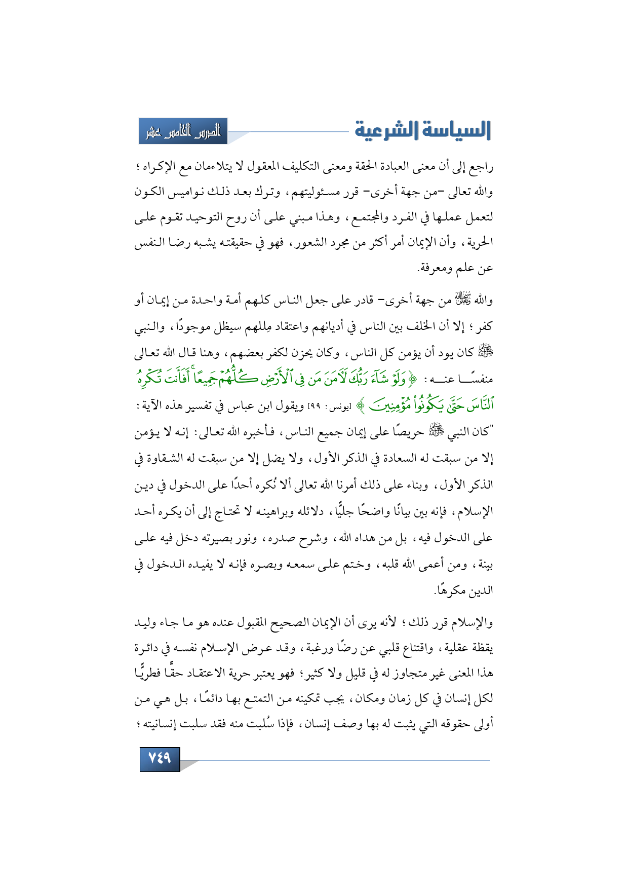 راجع إلى أن معنى العبادة الحقة ومعنى التكليف المعقول لا يتلاءمان مع الإكراه؛ والله تعالى -من جهة أخرى- قرر مسئوليتهم، وترك بعد ذلك نواميس الكون لتعمل عملها في الفرد والمجتمع، وهذا مبني على أن روح التوحيد تقوم على الحرية، وأن الإيمان أمر أكثر من مجرد الشعور، فهو في حقيقته يشبه رضا النفس عن علم ومعرفة.