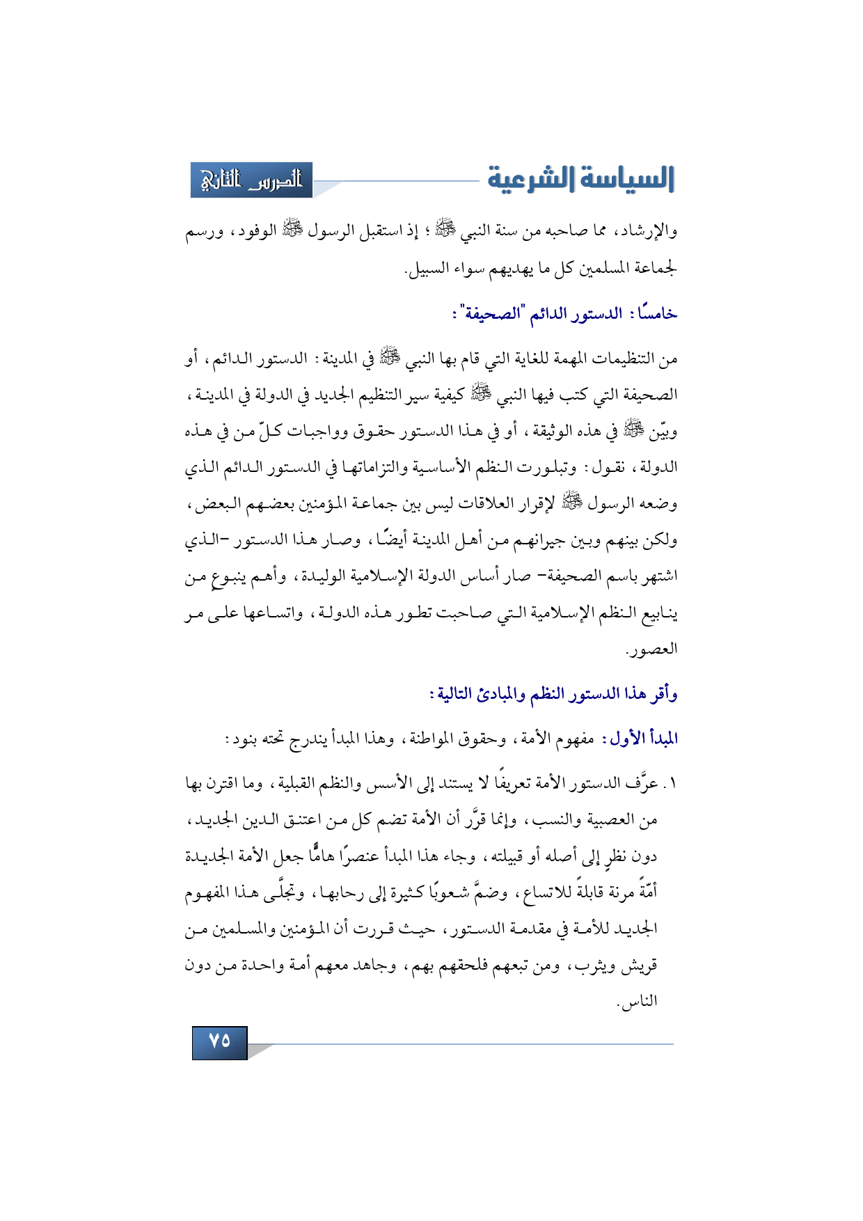 ومن التنظيمات -المهمة للغاية- في المدينة، والتي قام بها النبي -صلى الله عليه وسلم- هو الدستور الدائم، أو الصحيفة -كما يطلق أو كما يطلق عليه عند البعض- التي كتب فيها النبي -صلى الله عليه وسلم- كيفية سير التنظيم الجديد في الدولة في المدينة، وبين -صلى الله عليه وسلم- في هذه الوثيقة، أو في هذا الدستور حقوق، وواجبات كل من في هذه الدولة، نقول: وتبلورت النظم الأساسية والتزاماتها في الدستور الدائم الذي وضعه الرسول -صلى الله عليه وسلم- لإقرار العلاقات ليس بين جماعة المؤمنين بعضهم البعض، ولكن بينهم، وبين جيرانهم من أهل المدينة أيضًًا، وصار هذا الدستور -الذي اشتهر باسم الصحيفة- صار أساس الدولة الإسلامية الوليدة، وأهم ينبوعٍ من ينابيع النظم الإسلامية التي صاحبت تطور هذه الدولة، واتساعها على مر العصور.