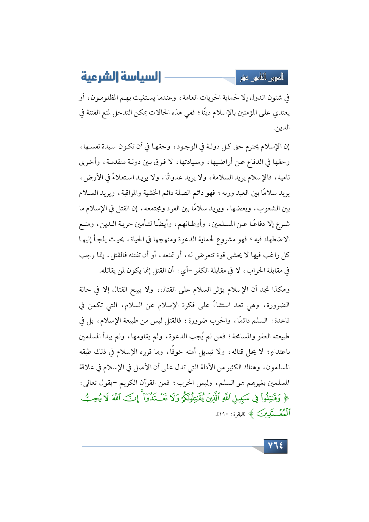 إن الإسلام يحترم حق كل دولة في الوجود، وحقها في أن تكون سيدة نفسها، وحقها في الدفاع عن أراضيها، وسيادتها، لا فرق بين دولة متقدمة، وأخرى نامية، فالإسلام يريد السلامة، ولا يريد عدوانًا، ولا يريد استعلاءً في الأرض، يريد سلامًا بين العبد، وربه؛ فهو دائم الصلة دائم الخشية والمراقبة، ويريد السلام بين الشعوب، وبعضها، ويريد سلامًا بين الفرد ومجتمعه، إن القتل في الإسلام ما شرع إلا دفاعًا عن المسلمين، وأوطانهم، وأيضًا لتأمين حرية الدين، ومنع الاضطهاد فيه؛ فهو مشروع لحماية الدعوة ومنهجها في الحياة، بحيث يلجأ إليها كل راغب فيها لا يخشى قوة تتعرض له، أو تمنعه، أو أن تفتنه فالقتل، إنما وجب في مقابلة الحراب، لا في مقابلة الكفر -أي: أن القتل إنما يكون لمن يقاتله.