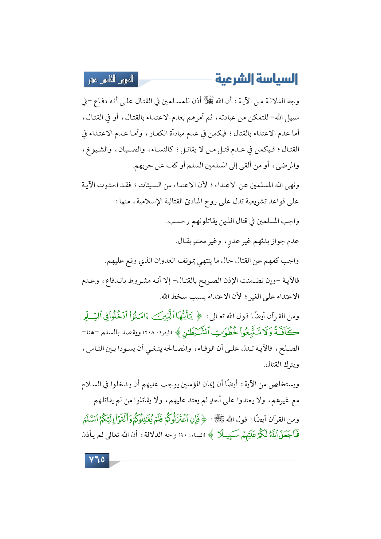 فالآية -وإن تضمنت الإذن الصريح بالقتال- إلا أنه مشروط بالدفاع، وعدم الاعتداء على الغير؛ لأن الاعتداء يسبب سخط الله، ومن القرآن أيضًا قول الله تعالى: {يَا أَيُّهَا الَّذِينَ آمَنُوا ادْخُلُوا فِي السِّلْمِ كَافَّةً وَلا تَتَّبِعُوا خُطُوَاتِ الشَّيْطَانِ} (البقرة: من الآية: 208) ويقصد بالسلم -هنا- الصلح، فالآية تدل على أن الوفاء، والمصالحة ينبغي أن يسودا بين الناس، ويترك القتال.