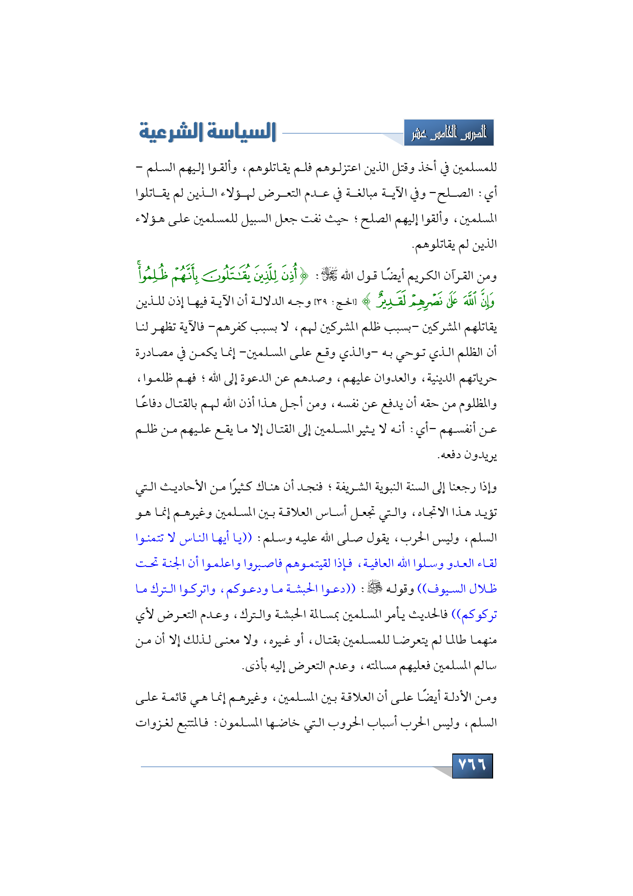 ومن القرآن الكريم أيضًا قول الله -تبارك وتعالى-: {أُذِنَ لِلَّذِينَ يُقَاتَلُونَ بِأَنَّهُمْ ظُلِمُوا وَإِنَّ اللَّهَ عَلَى نَصْرِهِمْ لَقَدِيرٌ} (الحج: الآية: 39) وجه الدلالة أن الآية فيها إذن للذين يقاتلهم المشركين -بسبب ظلم المشركين لهم، لا بسبب كفرهم- فالآية تظهر لنا أن الظلم الذي توحي به -والذي وقع على المسلمين- إنما يكمن في مصادرة حرياتهم الدينية، والعدوان عليهم، وصدهم عن الدعوة إلى الله؛ فهم ظلموا، والمظلوم من حقه أن يدفع عن نفسه، ومن أجل هذا أذن الله لهم بالقتال دفاعًا عن أنفسهم -أي: أنه لا يثير المسلمين إلى القتال إلا ما يقع عليهم من ظلم يريدون دفعه.