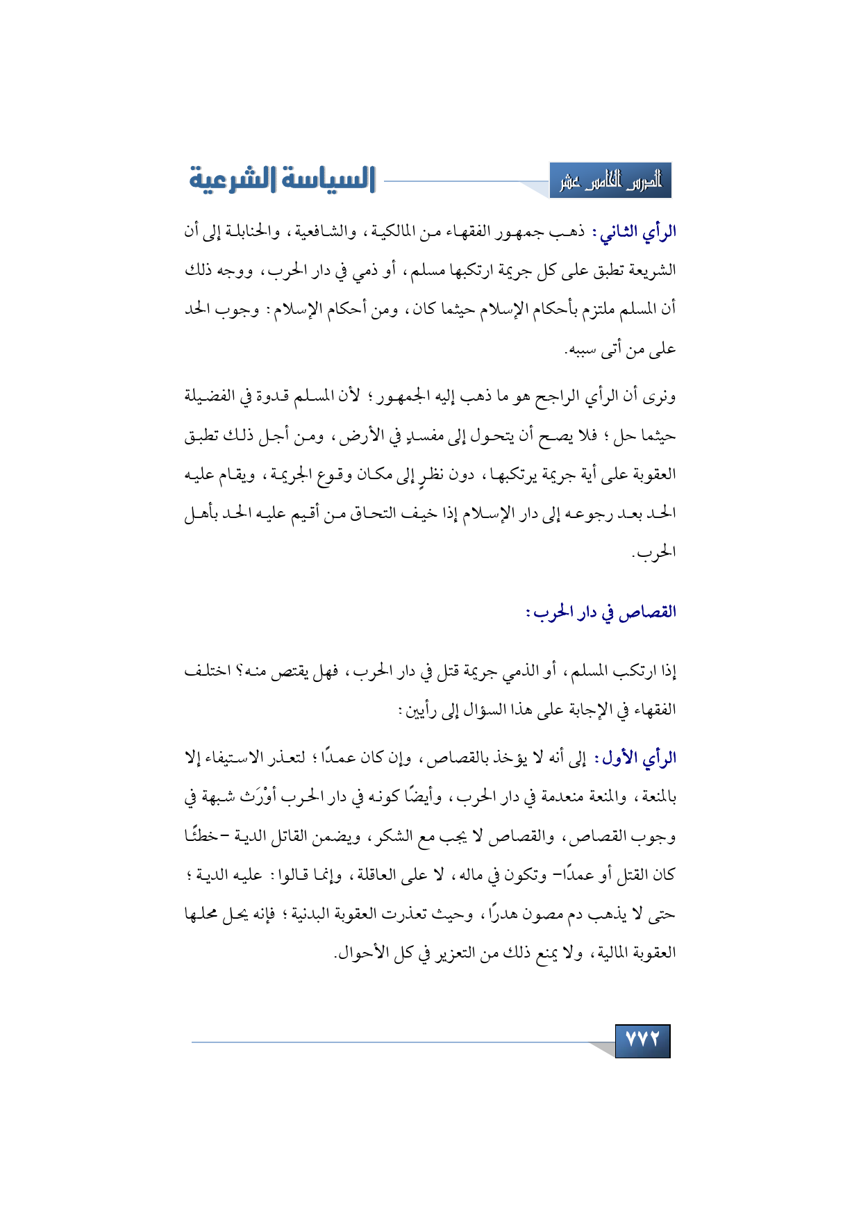 ونرى أن الرأي الراجح هو ما ذهب إليه الجمهور؛ لأن المسلم قدوة في الفضيلة حيثما حل؛ فلا يصح أن يتحول إلى مفسدٍ في الأرض، ومن أجل ذلك تطبق العقوبة على أية جريمة يرتكبها، دون نظرٍ إلى مكان وقوع الجريمة، ويقام عليه الحد بعد رجوعه إلى دار الإسلام إذا خيف التحاق من أقيم عليه الحد بأهل الحرب، وبالنسبة للقصاص في دار الحرب.