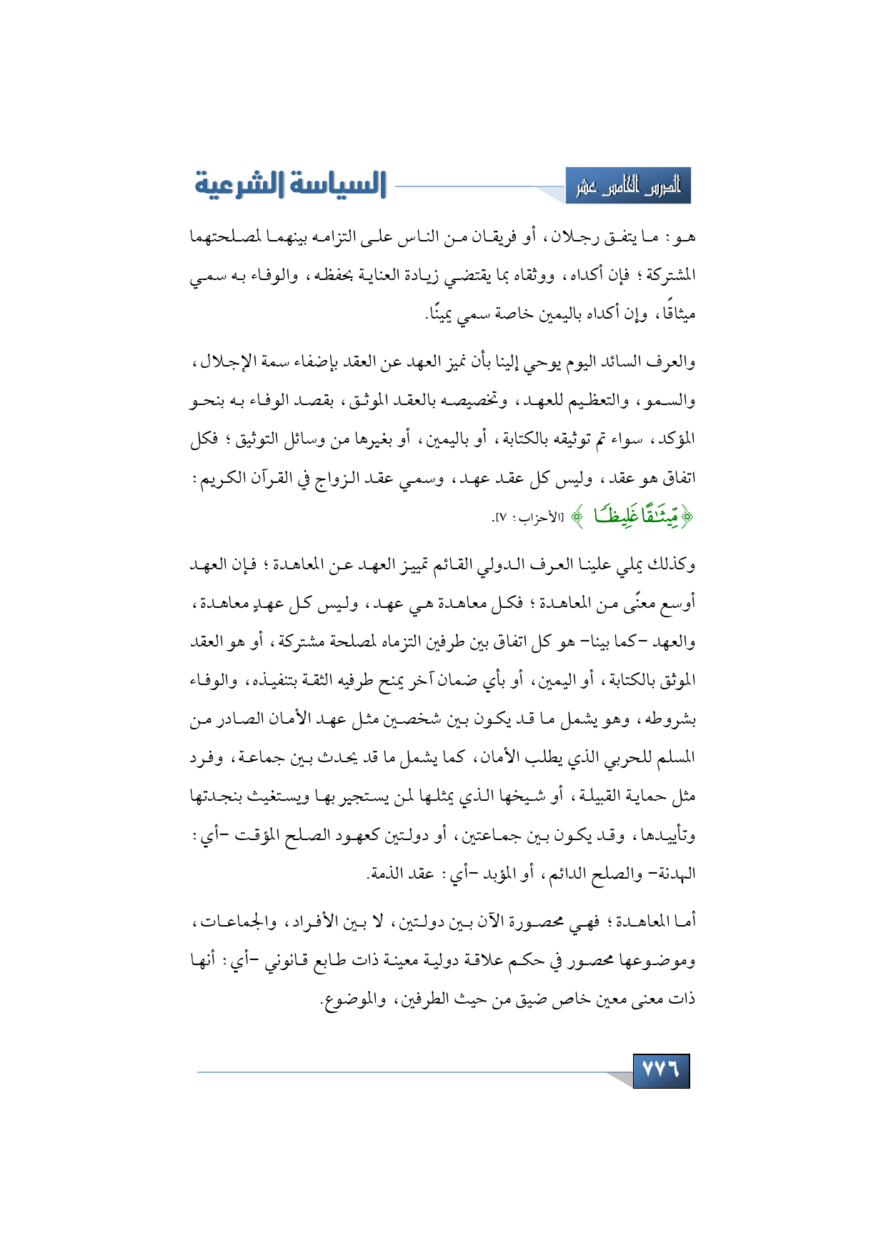 وكذلك يملي علينا العرف الدولي القائم تمييز العهد عن المعاهدة؛ فإن العهد أوسع معنًى من المعاهدة؛ فكل معاهدة هي عهد، وليس كل عهدٍ معاهدة، والعهد -كما بينا- هو كل اتفاق بين طرفين التزماه لمصلحة مشتركة، أو هو العقد الموثق بالكتابة، أو اليمين، أو بأي ضمان آخر يمنح طرفيه الثقة بتنفيذه، والوفاء بشروطه، وهو يشمل ما قد يكون بين شخصين مثل عهد الأمان الصادر من المسلم للحربي الذي يطلب الآمان، كما يشمل ما قد يحدث بين جماعة، وفرد مثل حماية القبيلة، أو شيخها الذي يمثلها لمن يستجير بها ويستغيث بنجدتها وتأييدها، وقد يكون بين جماعتين، أو دولتين كعهود الصلح المؤقت -أي: الهدنة- والصلح الدائم، أو المؤبد -أي: عقد الذمة.