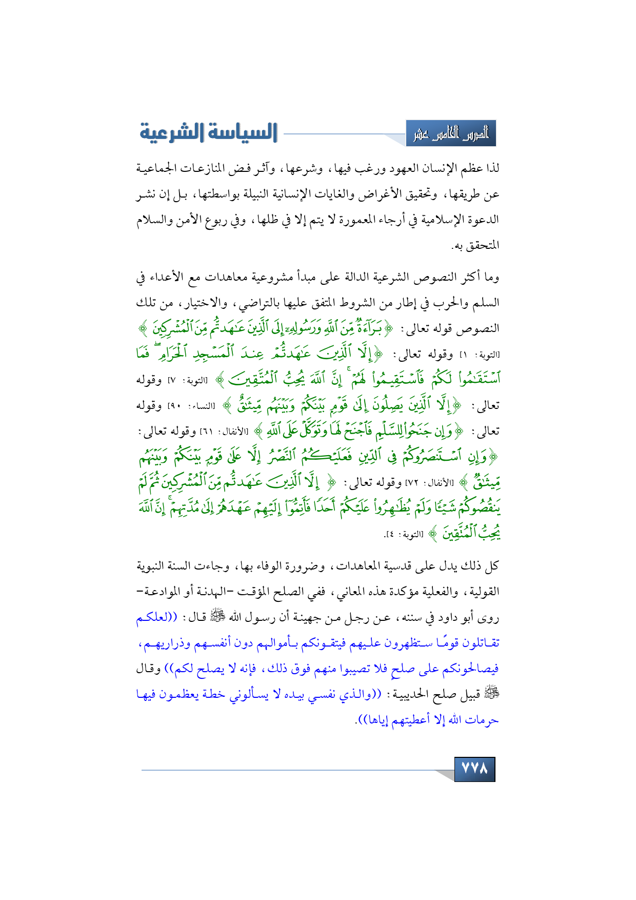 كل ذلك يدل على قدسية المعاهدات، وضرورة الوفاء بها، وجاءت السنة النبوية القولية، والفعلية مؤكدة هذه المعاني، ففي الصلح المؤقت -الهدنة أو الموادعة- روى أبو داود في سننه، عن رجل من جهينة: ((أتى رسول الله -صلى الله عليه وسلم- قال: لعلكم تقاتلون قومًا ستظهرون عليهم فيتقونكم بأموالهم دون أنفسهم وذراريهم فيصالحونكم على صلحٍ فلا تصيبوا منهم فوق ذلك فإنه لا يصلح لكم)) وقال -صلى الله عليه وسلم- قبيل صلح الحديبية: ((والذي نفسي بيده لا يسألوني خطة يعظمون فيها حرمات الله إلا أعطيتهم إياها)).