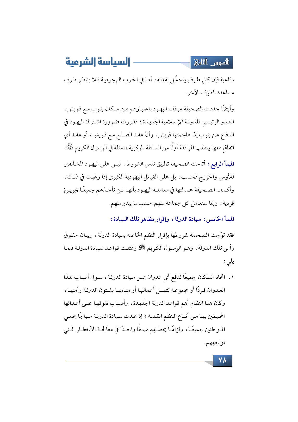 وتحدثت الصحيفة عن سيادة الدولة، وإقرار مظاهر تلك السياسة، وتوجت الصحيفة شروطها بإقرار النظم الخاصة بسيادة الدولة، وبيان حقوق رأس تلك الدولة، وهو الرسول الكريم -صلى الله عليه وسلم- وتمثلت قواعد سيادة الدولة فيما يلي: